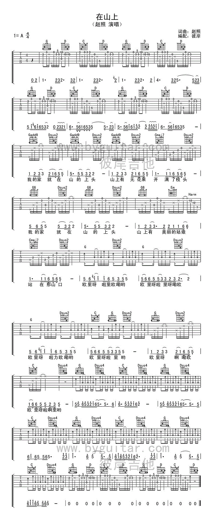 曲谱介绍: 赵照《在山上》吉他弹唱谱,采用A调指法编配,彼岸吉他编配出品,共有1张高清图谱,免翻页排版设计。