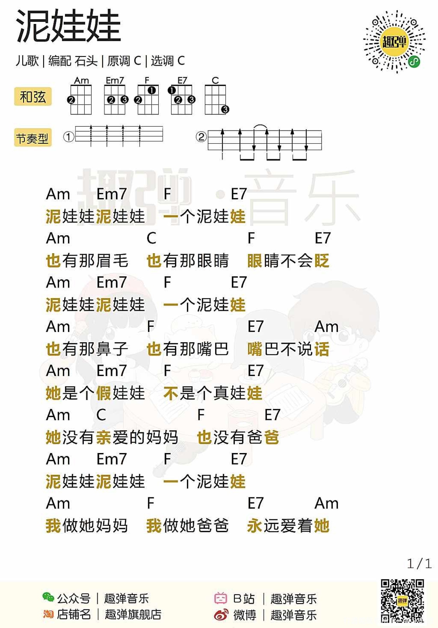 曲谱介绍: 儿歌《泥娃娃》尤克里里谱,共有1张高清图谱,免翻页排版设计。