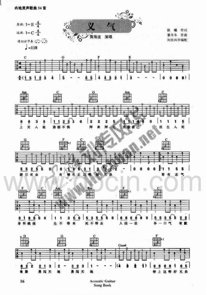 曲谱介绍: 黄海波《义气》吉他弹唱谱,采用C调指法编配,刘传风华编配出品,共有2张高清图谱,免翻页排版设计。