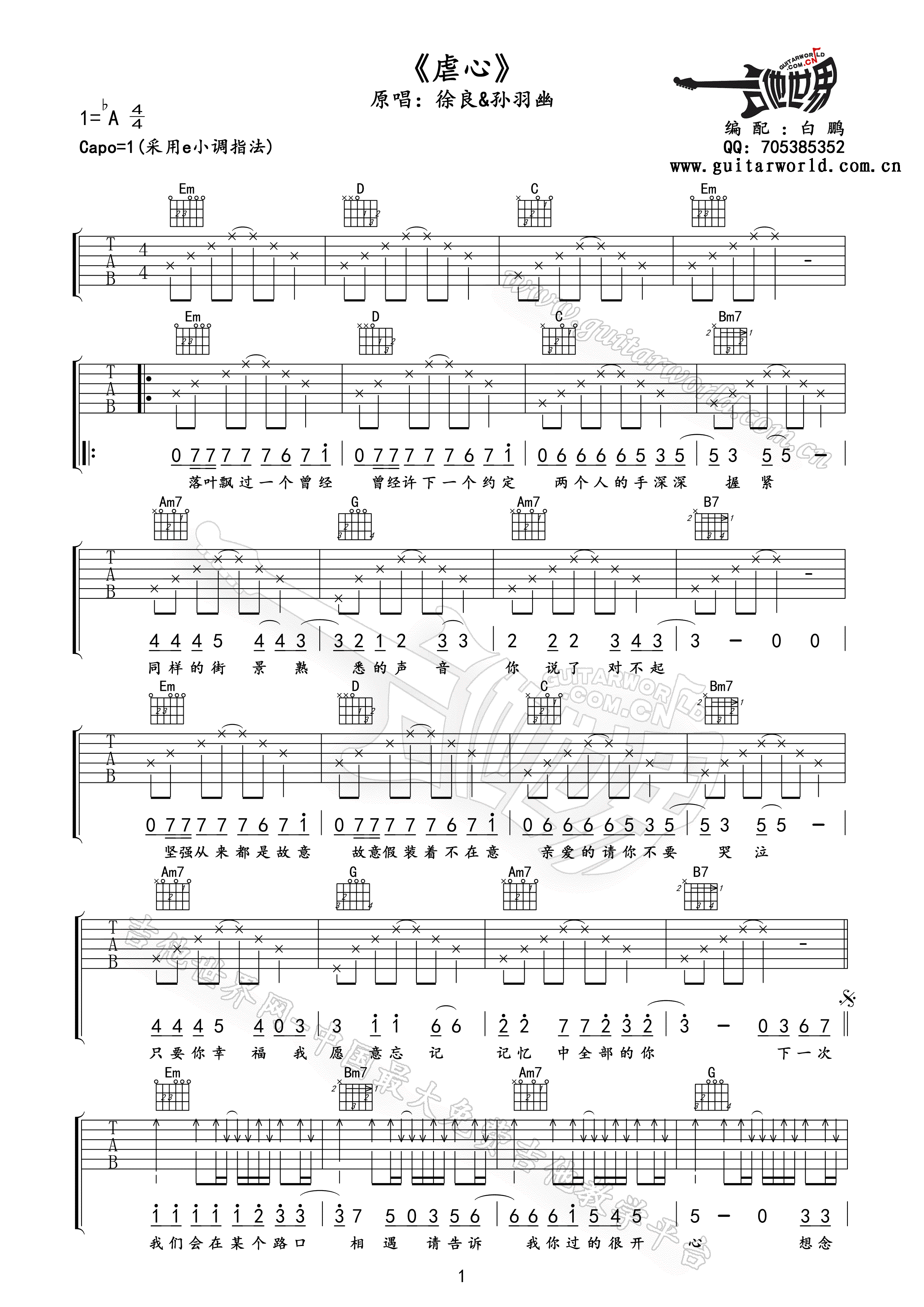 曲谱介绍: 徐良《虐心》吉他弹唱谱,采用A调指法编配,吉他世界编配出品,共有2张高清图谱,免翻页排版设计。