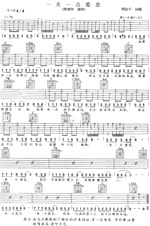 曲谱介绍: 梁朝伟《一天一点爱恋》吉他弹唱谱,采用F调指法编配,共有1张高清图谱,免翻页排版设计。