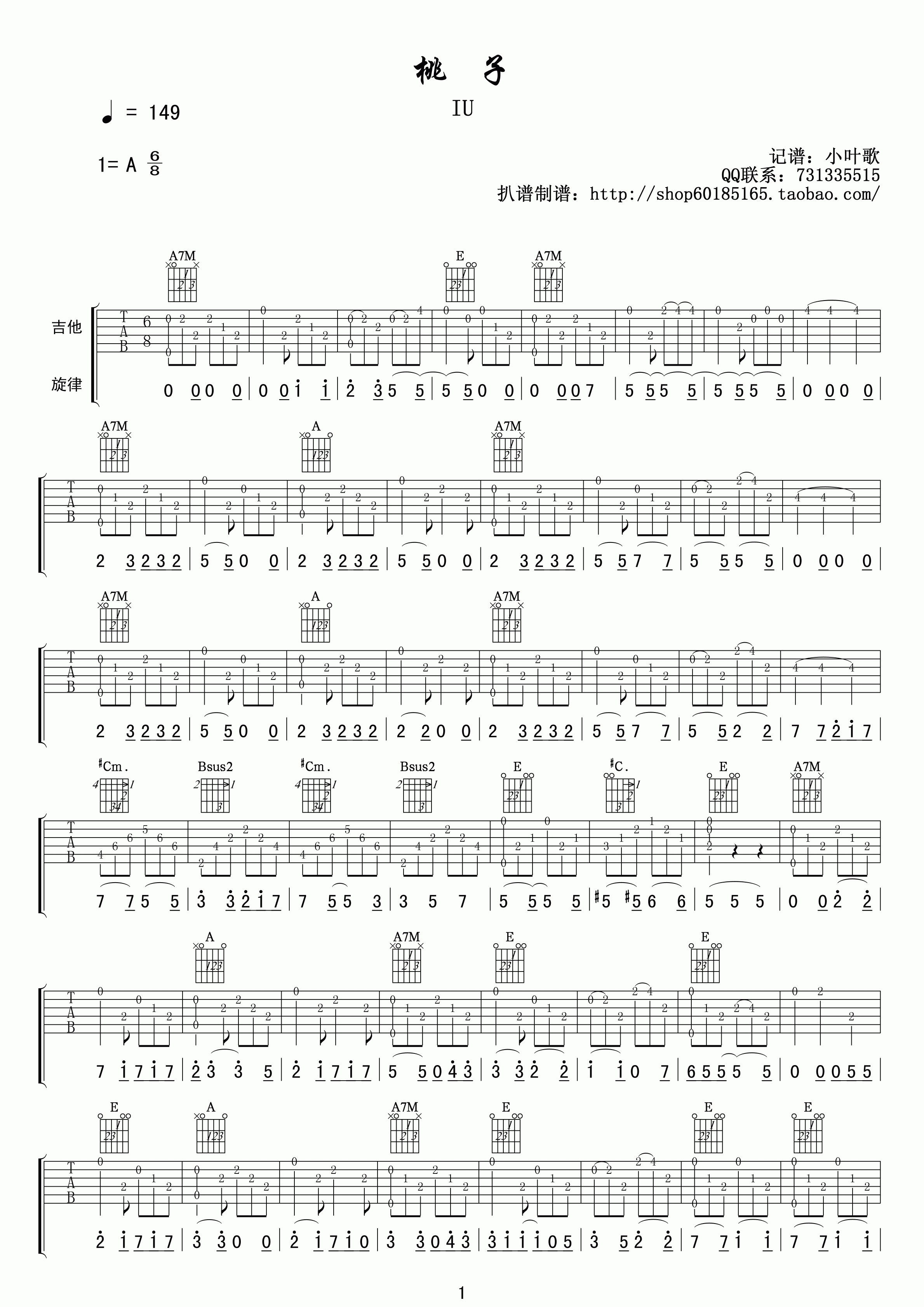 曲谱介绍: IU《桃子》吉他弹唱谱,采用A调指法编配,小叶歌吉他编配出品,共有3张高清图谱。