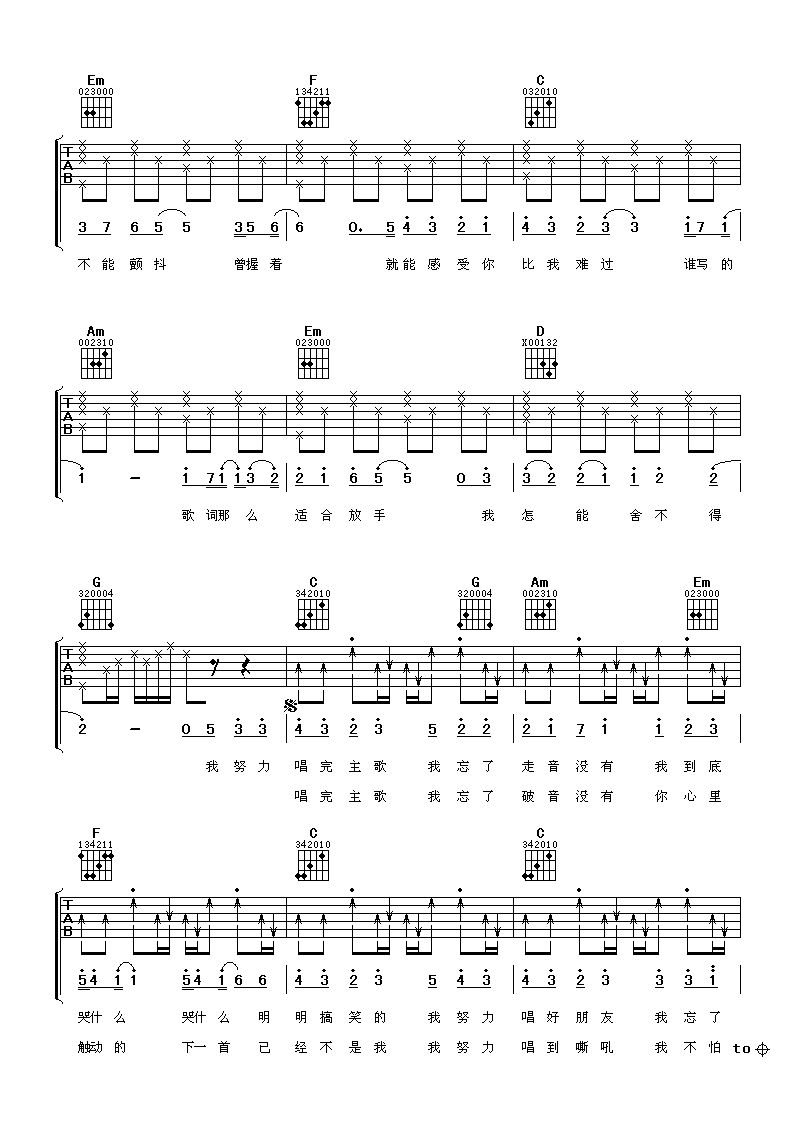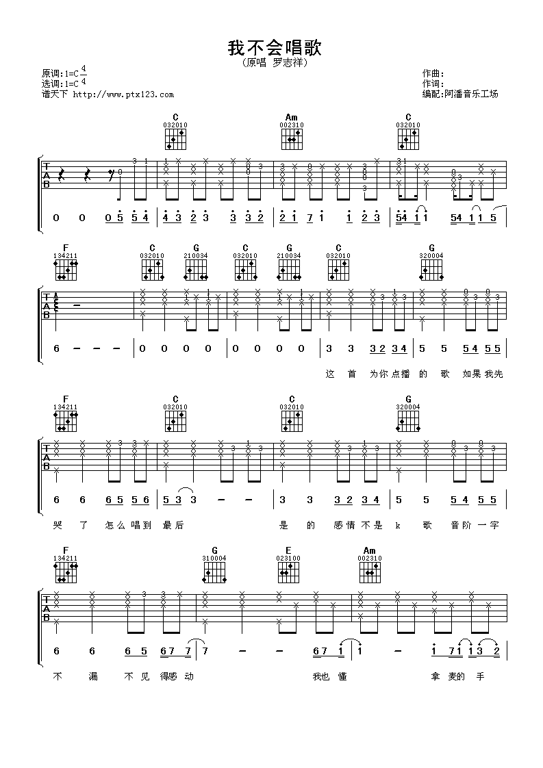 曲谱介绍: 罗志祥《我不会唱歌》吉他弹唱谱,采用C调指法编配,阿潘音乐工场编配出品,共有4张高清图谱。
