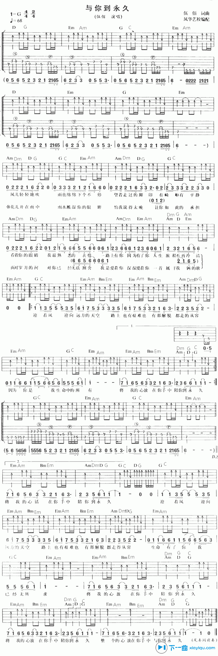 曲谱介绍: 伍佰《与你到永久》吉他弹唱谱,采用G调指法编配,风华艺校编配出品,共有1张高清图谱,免翻页排版设计。