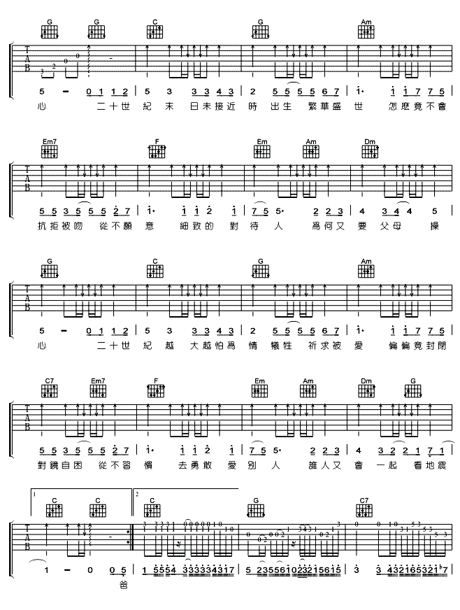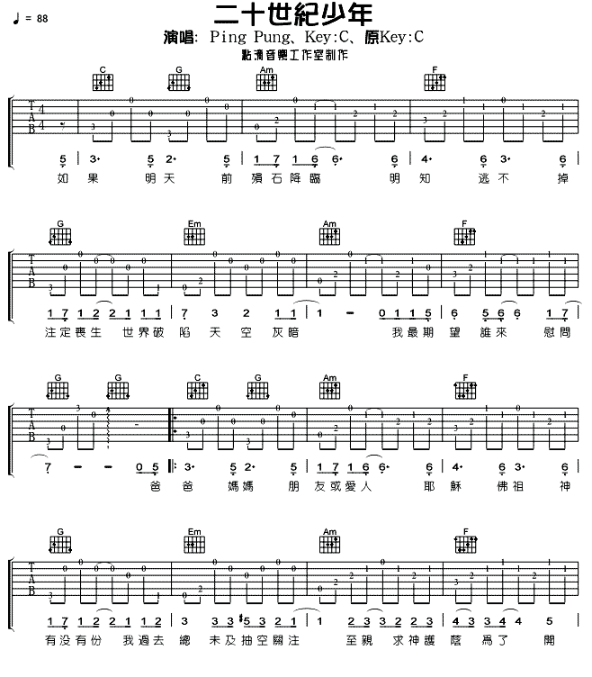 曲谱介绍: Ping《二十世纪少年》吉他弹唱谱,采用C调指法编配,共有3张高清图谱。