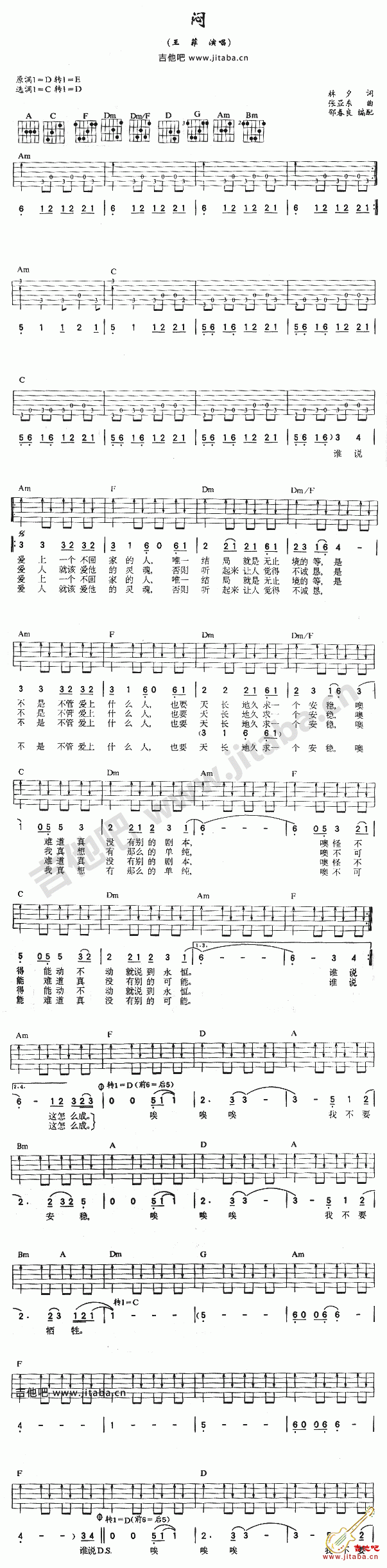 曲谱介绍: 王菲《闷》吉他弹唱谱,采用C调指法编配,吉他吧编配出品,共有1张高清图谱,免翻页排版设计。