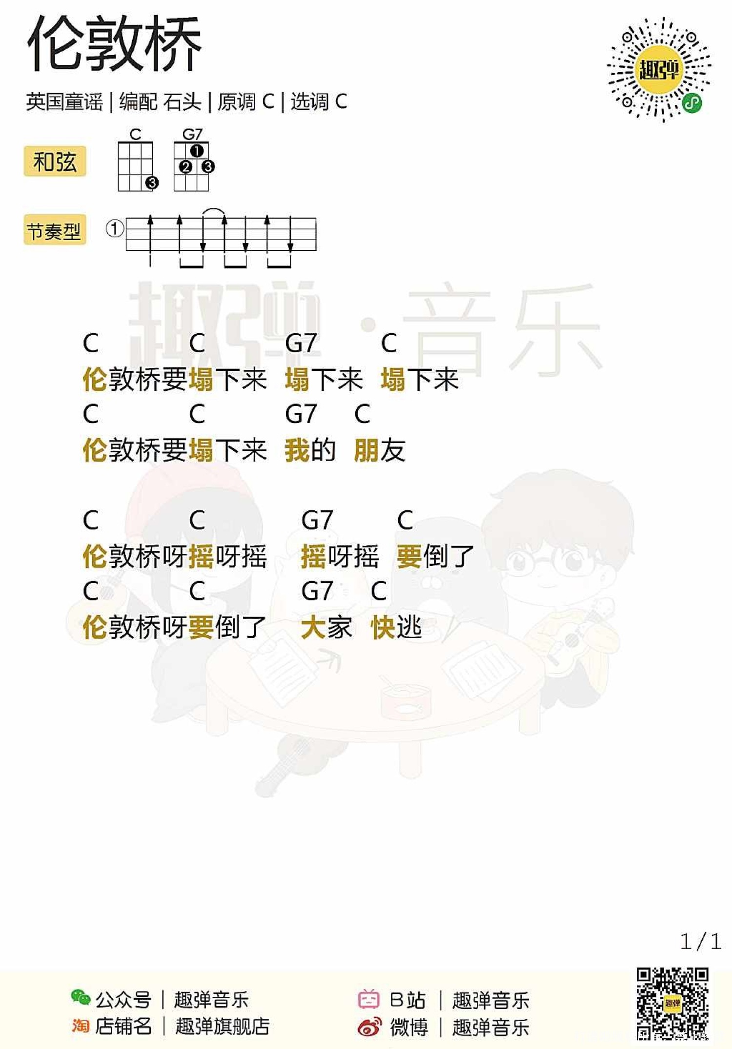 曲谱介绍: 英国童谣《伦敦桥》尤克里里谱,共有1张高清图谱,免翻页排版设计。