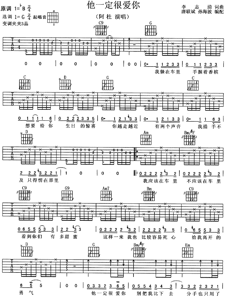 曲谱介绍: 附前奏《他一定很爱你》吉他弹唱谱,采用B调指法编配,共有2张高清图谱,免翻页排版设计。
