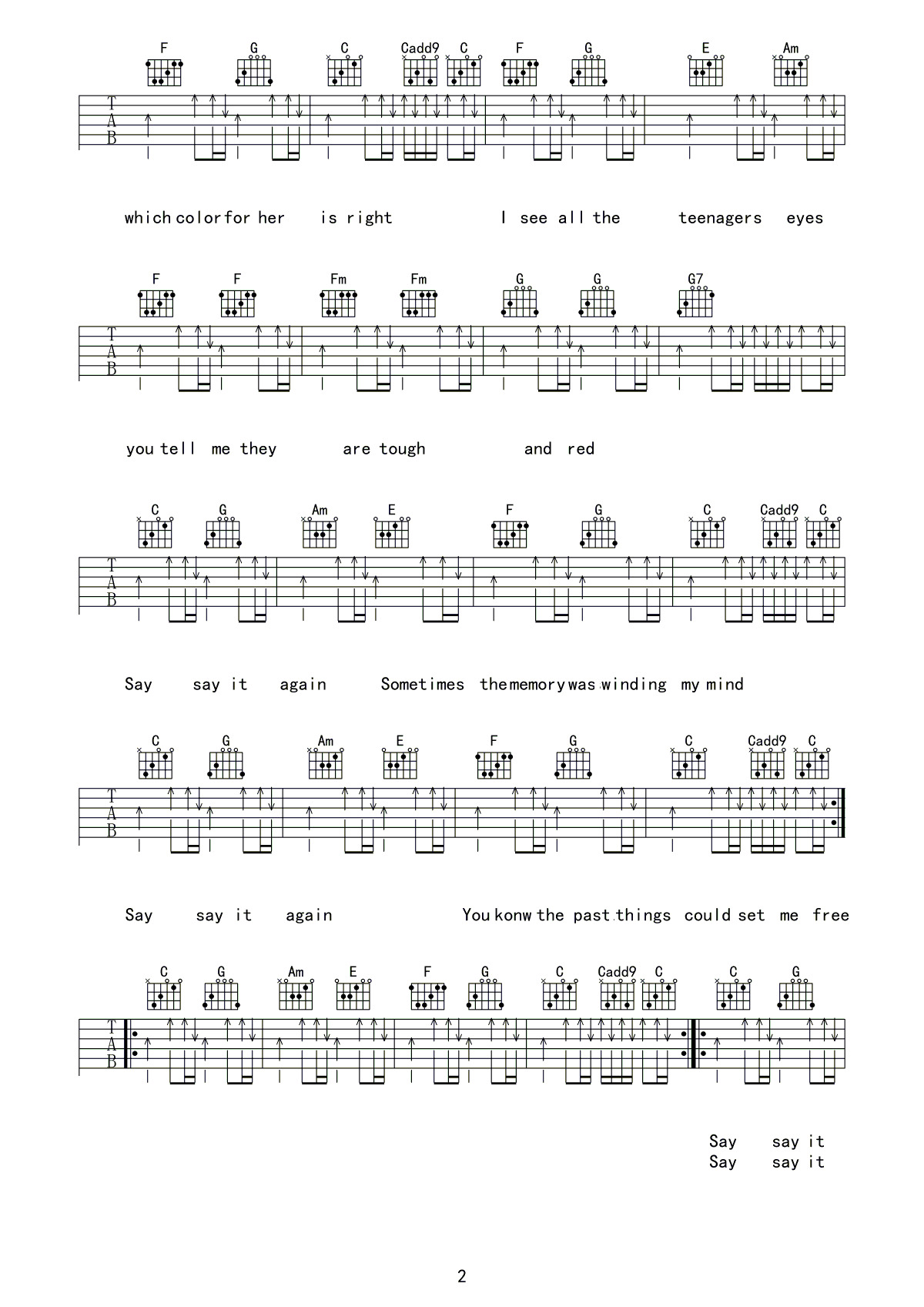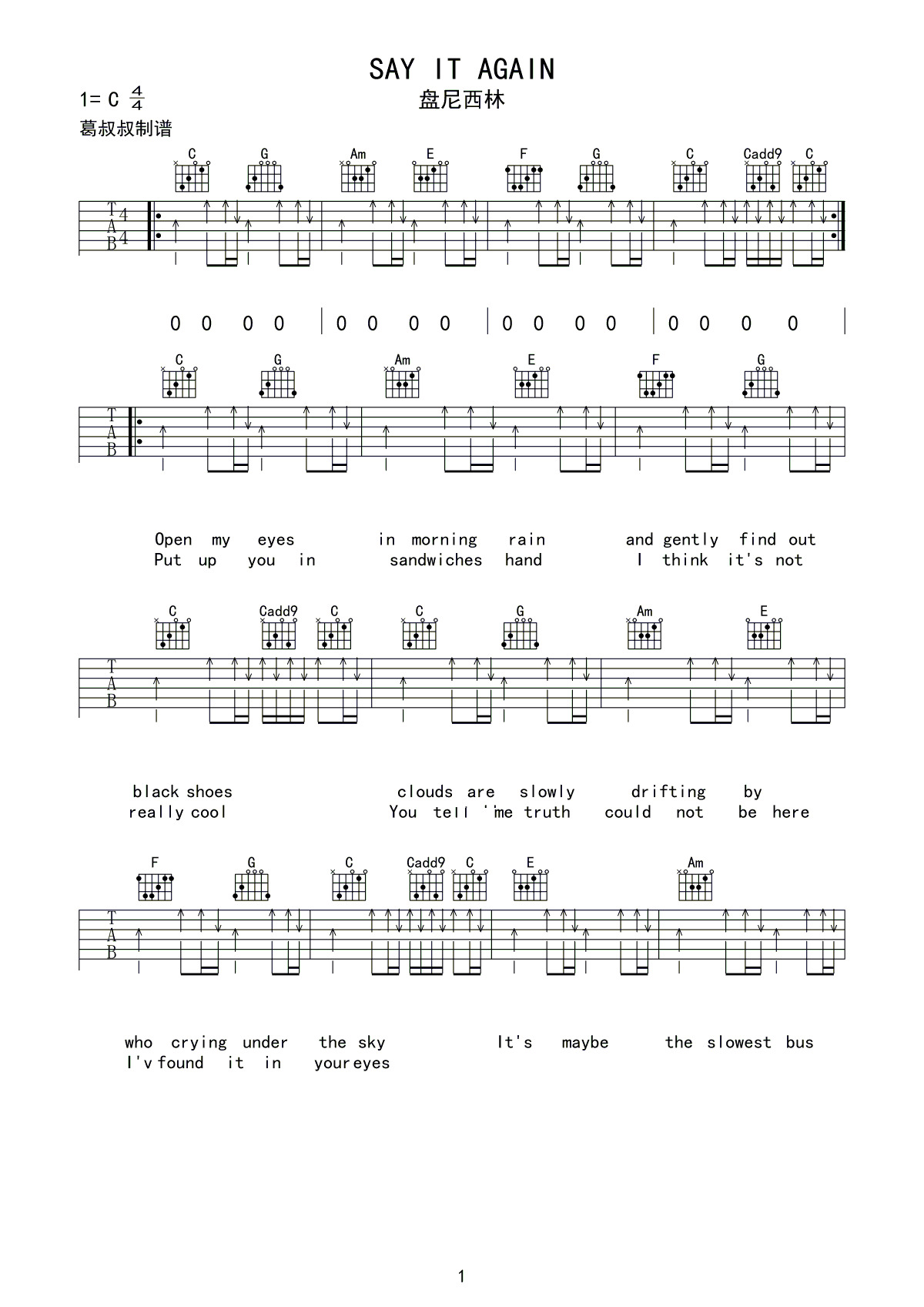 曲谱介绍: Say《Sayitagain》吉他弹唱谱,采用C调指法编配,共有3张高清图谱。