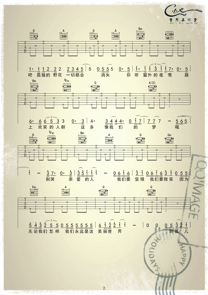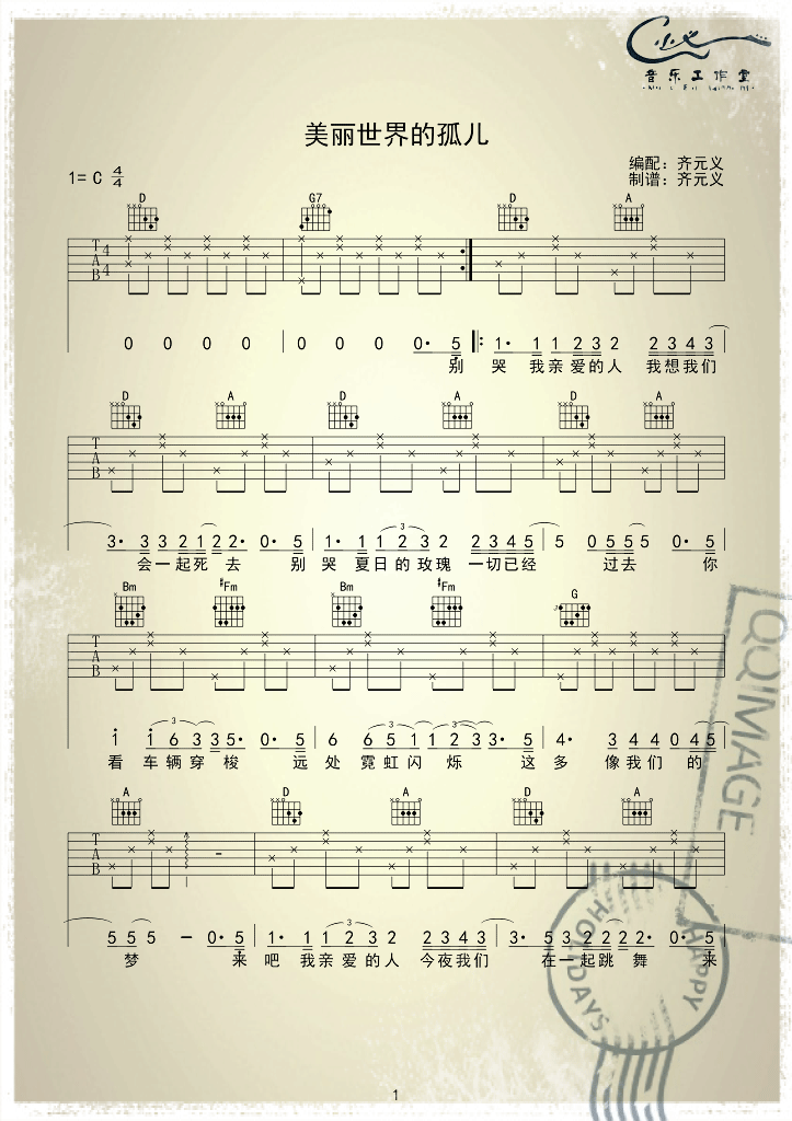 曲谱介绍: 汪峰《美丽世界的孤儿》吉他弹唱谱,采用C调指法编配,小义音乐工作室编配出品,共有3张高清图谱。