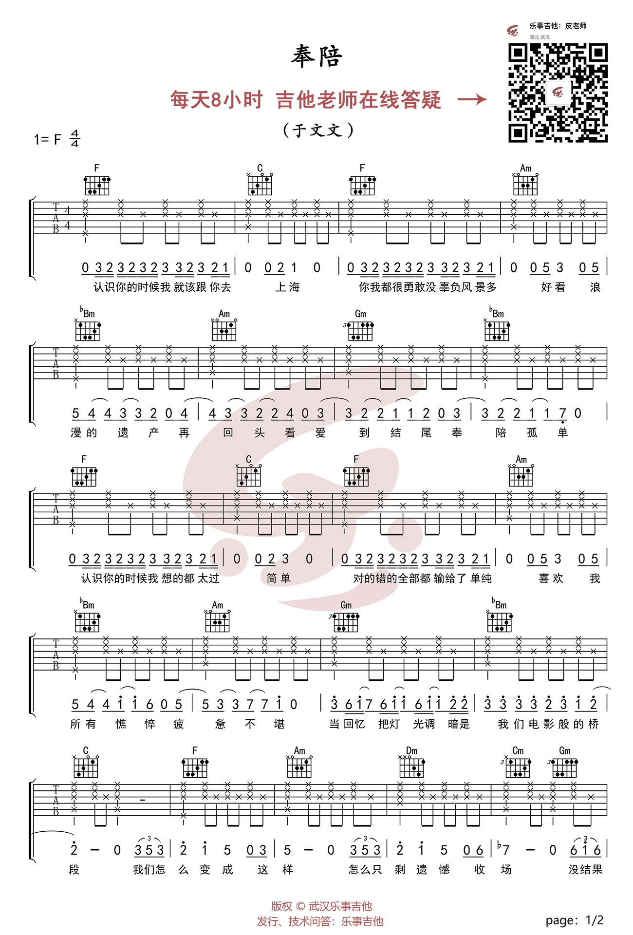 曲谱介绍: 于文文《奉陪》吉他弹唱谱,采用F调指法编配,乐事吉他编配出品,共有2张高清图谱,免翻页排版设计。