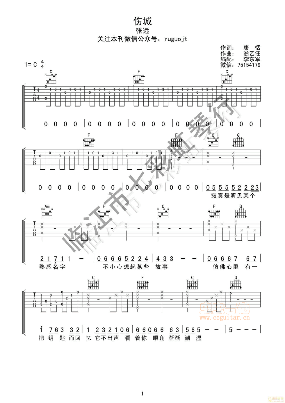 曲谱介绍: 张远《伤城》吉他弹唱谱,采用C调指法编配,临江市七彩虹琴行编配出品,共有2张高清图谱,免翻页排版设计。