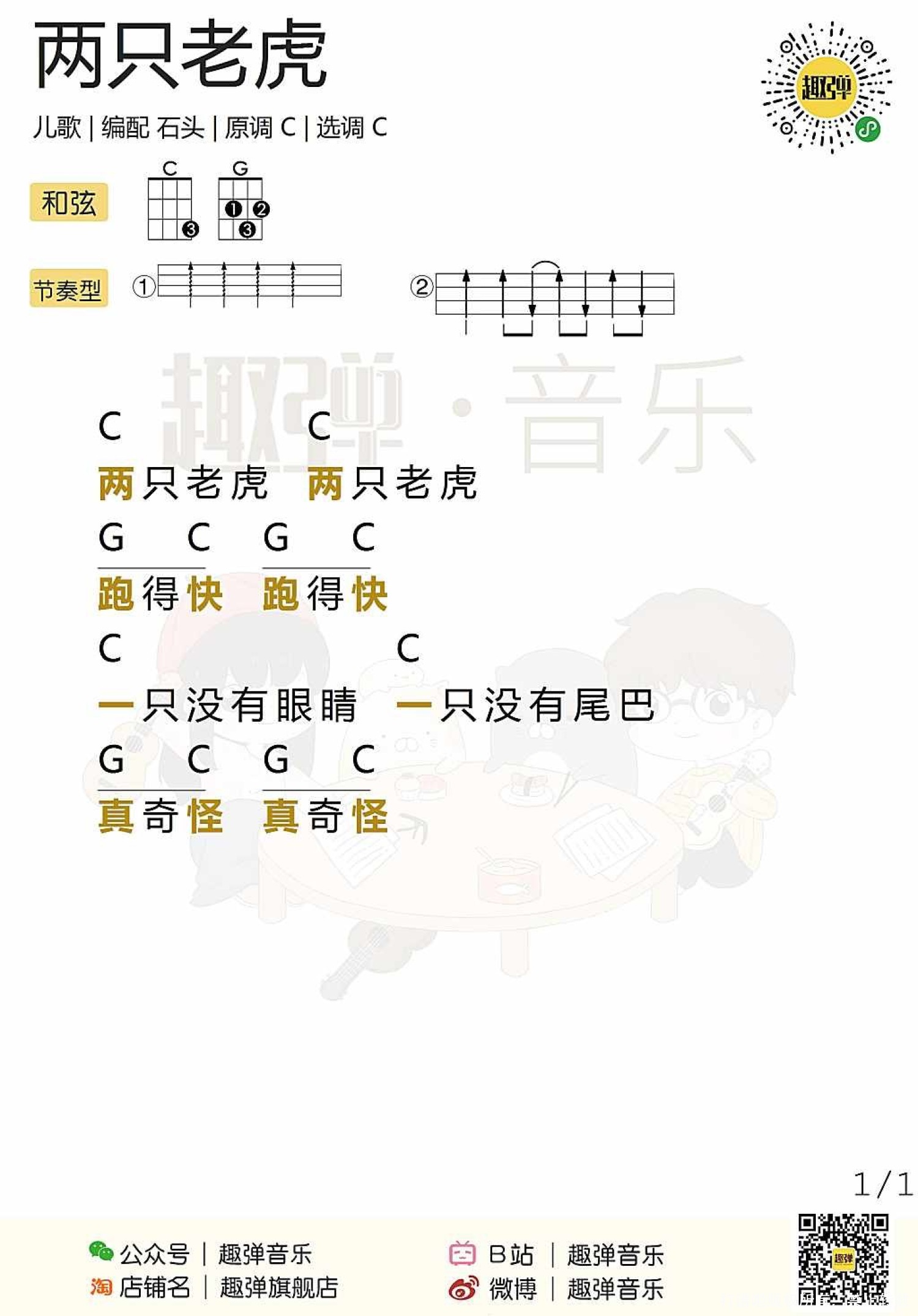 曲谱介绍: 儿歌《两只老虎》尤克里里谱,共有1张高清图谱,免翻页排版设计。