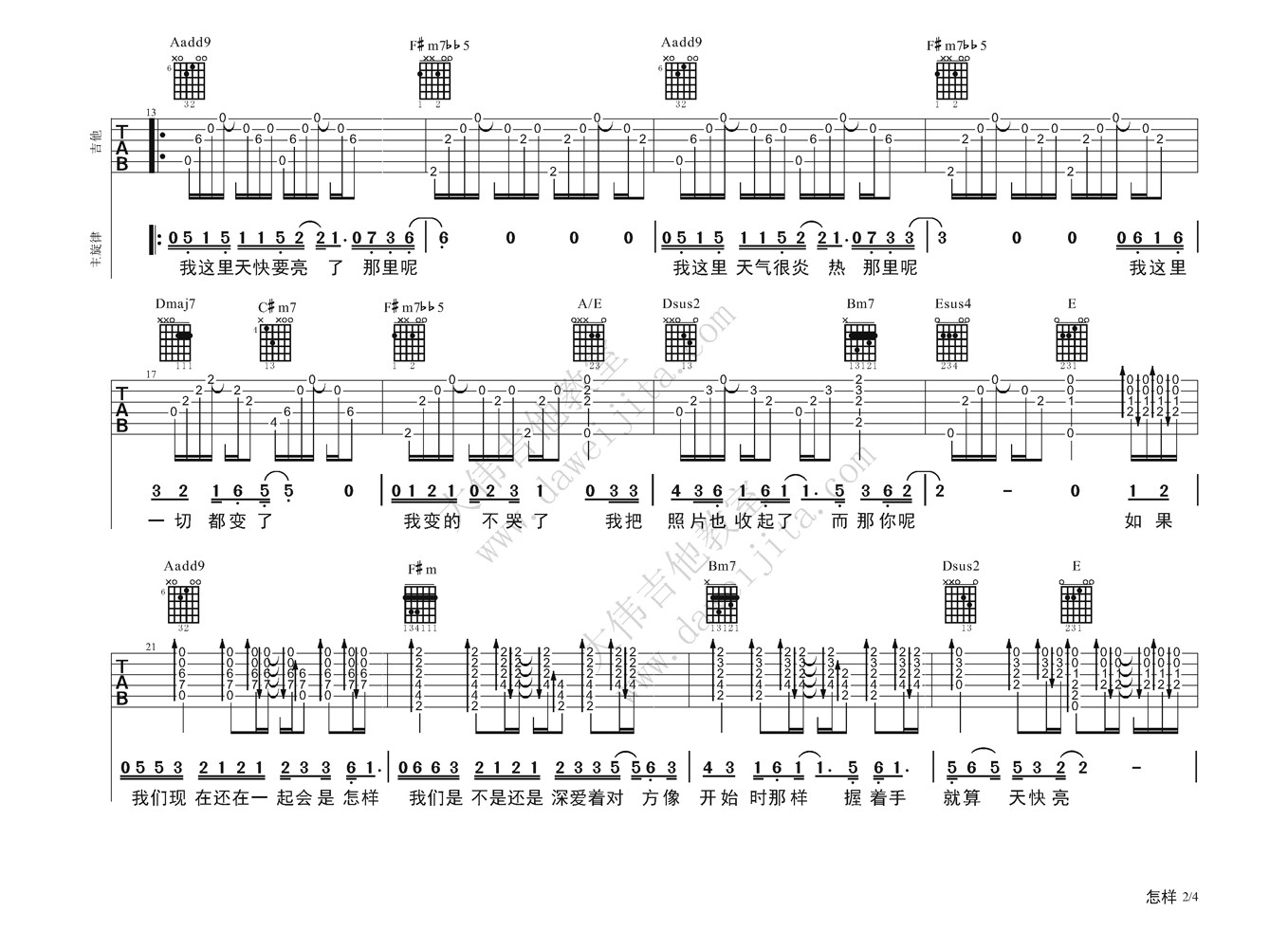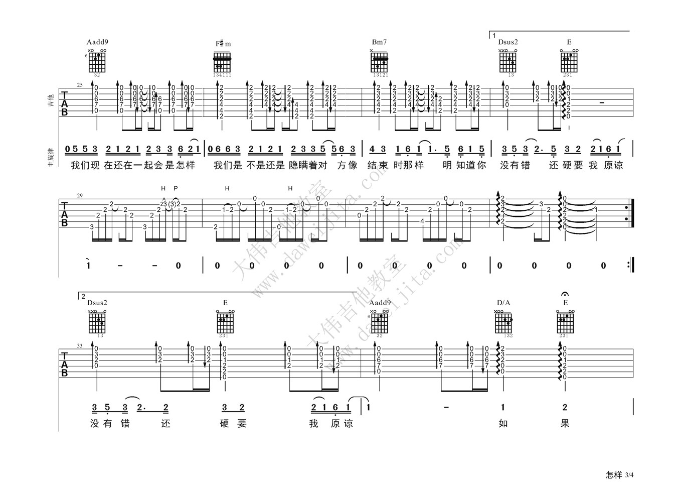 曲谱介绍: 戴佩妮《怎样》吉他弹唱谱,采用A调指法编配,大伟吉他教室编配出品,共有4张高清图谱。