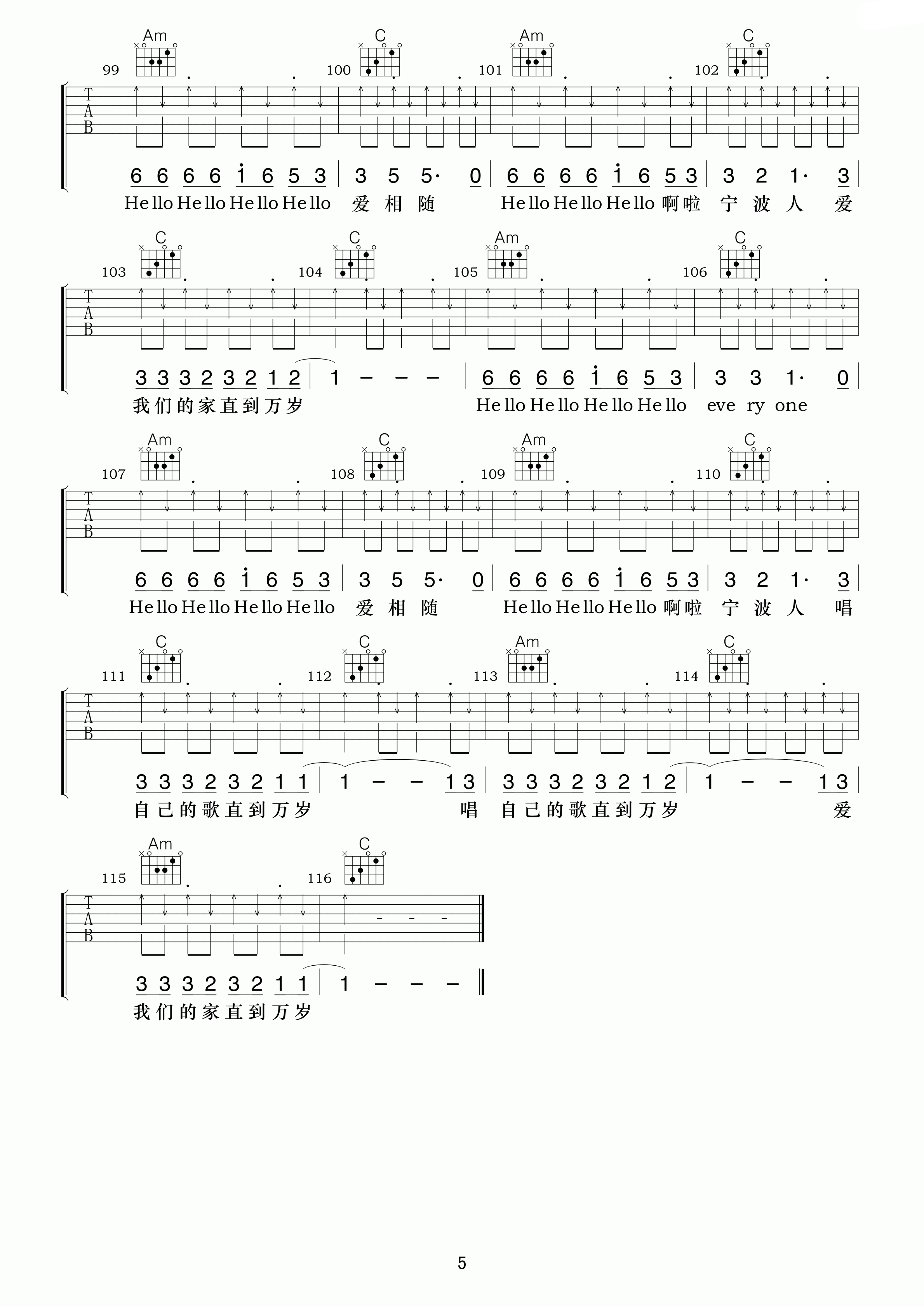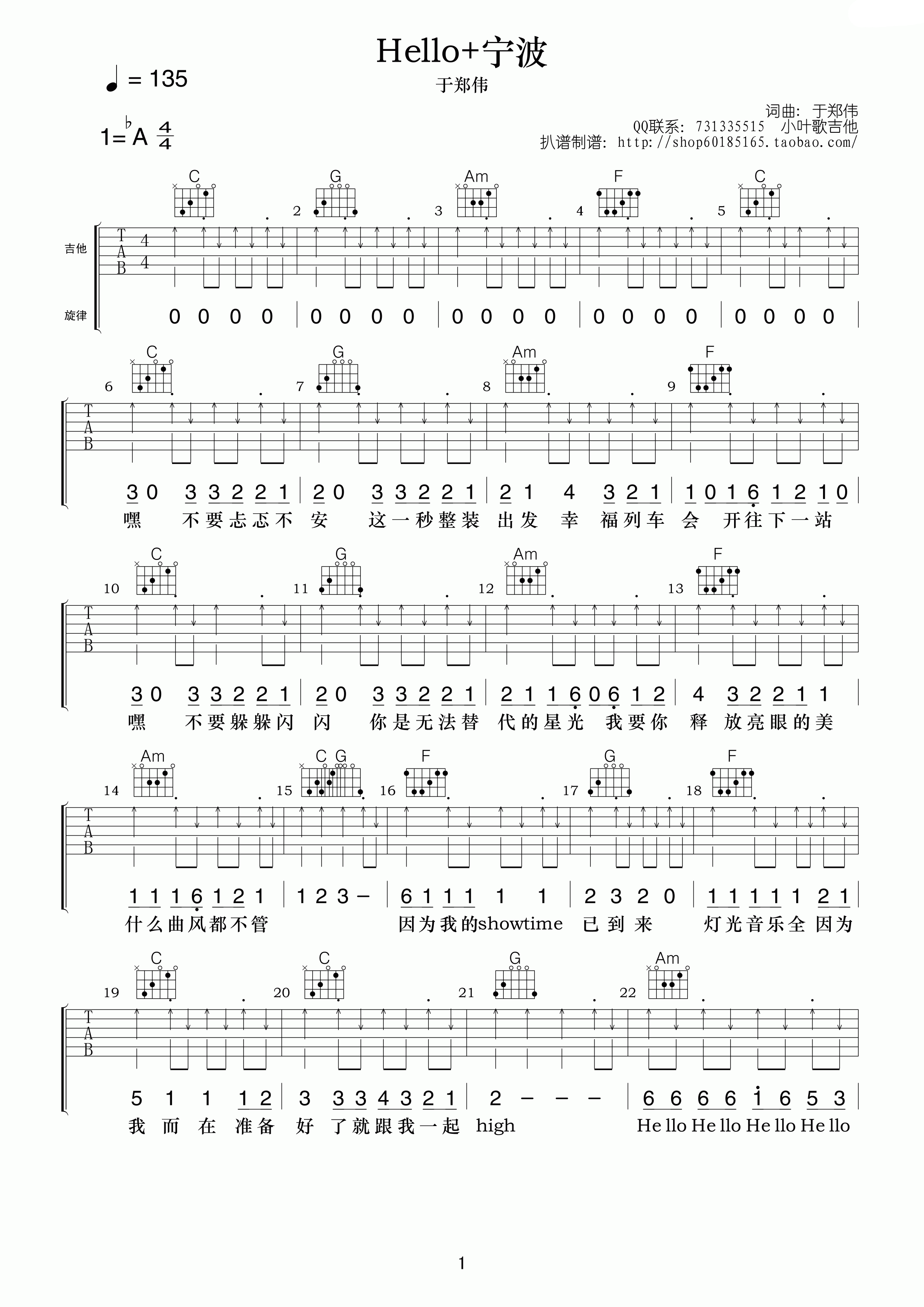 曲谱介绍: 于郑伟《Hello宁波》吉他弹唱谱,采用A调指法编配,小叶歌吉他编配出品,共有5张高清图谱。