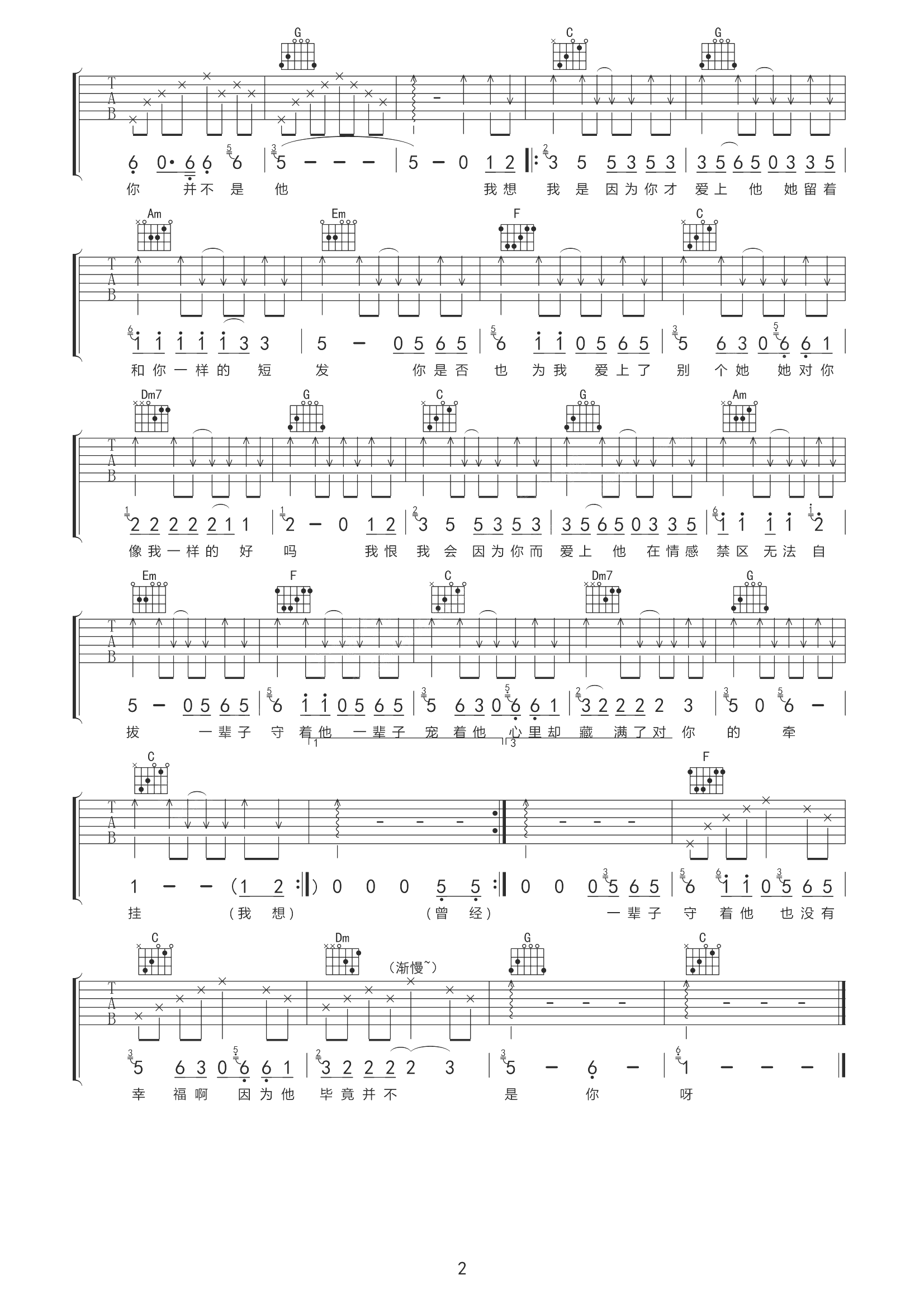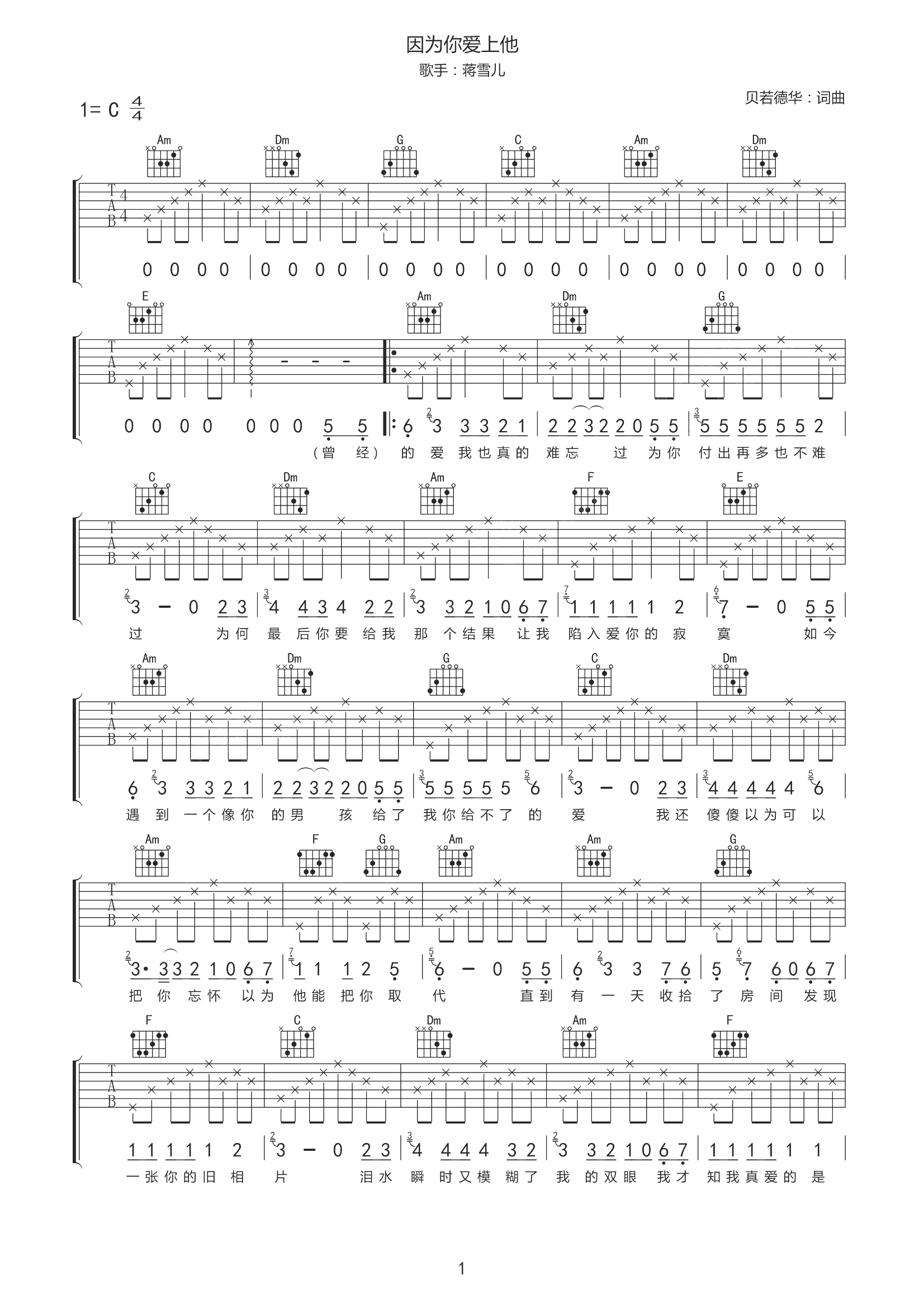 曲谱介绍: 蒋雪儿《因为你爱上他》吉他弹唱谱,采用C调指法编配,共有2张高清图谱,免翻页排版设计。