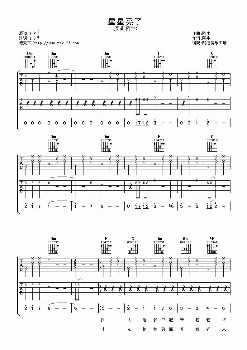曲谱介绍: 阿牛《星星亮了》吉他弹唱谱,采用F调指法编配,阿潘音乐工场编配出品,共有3张高清图谱。