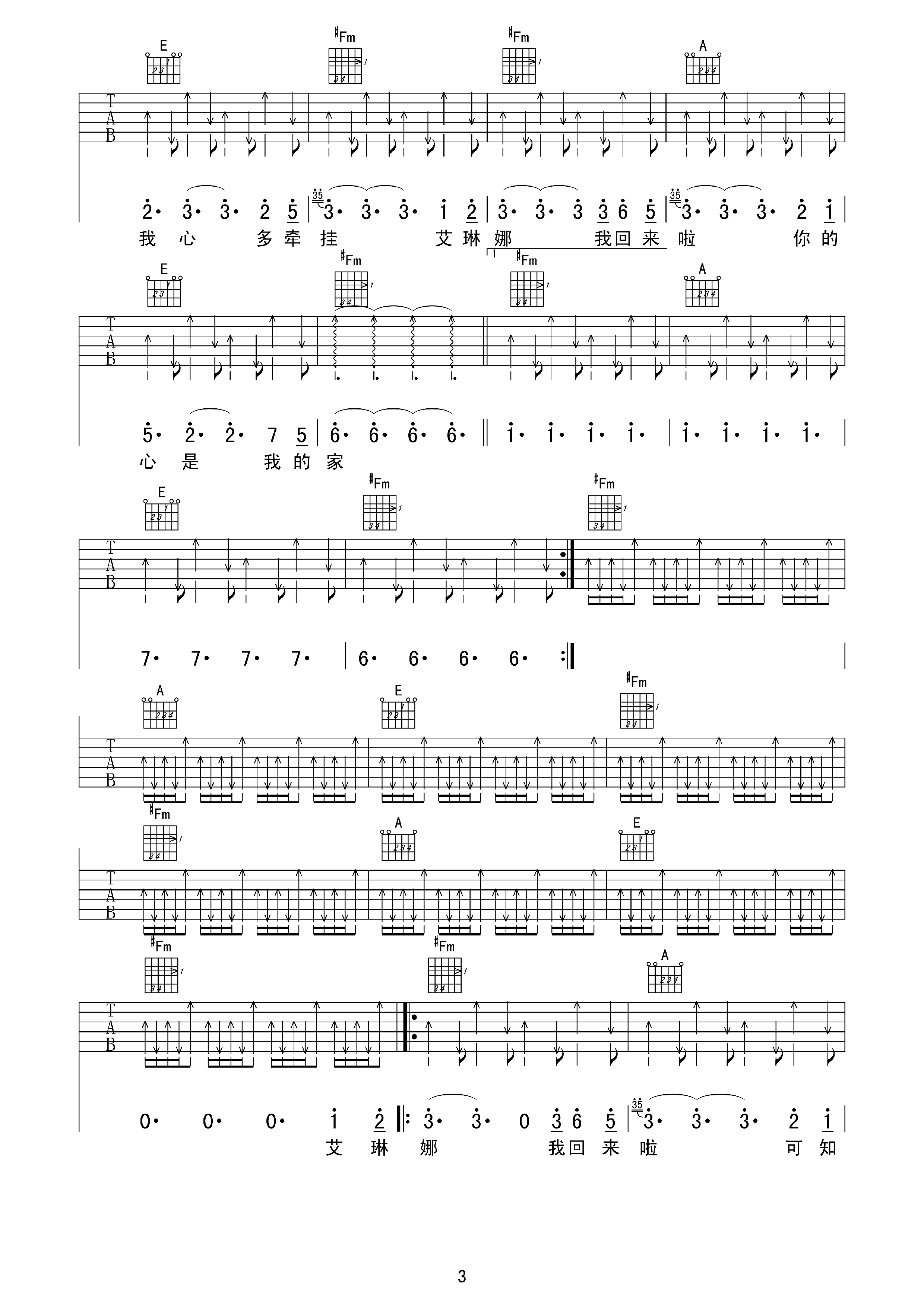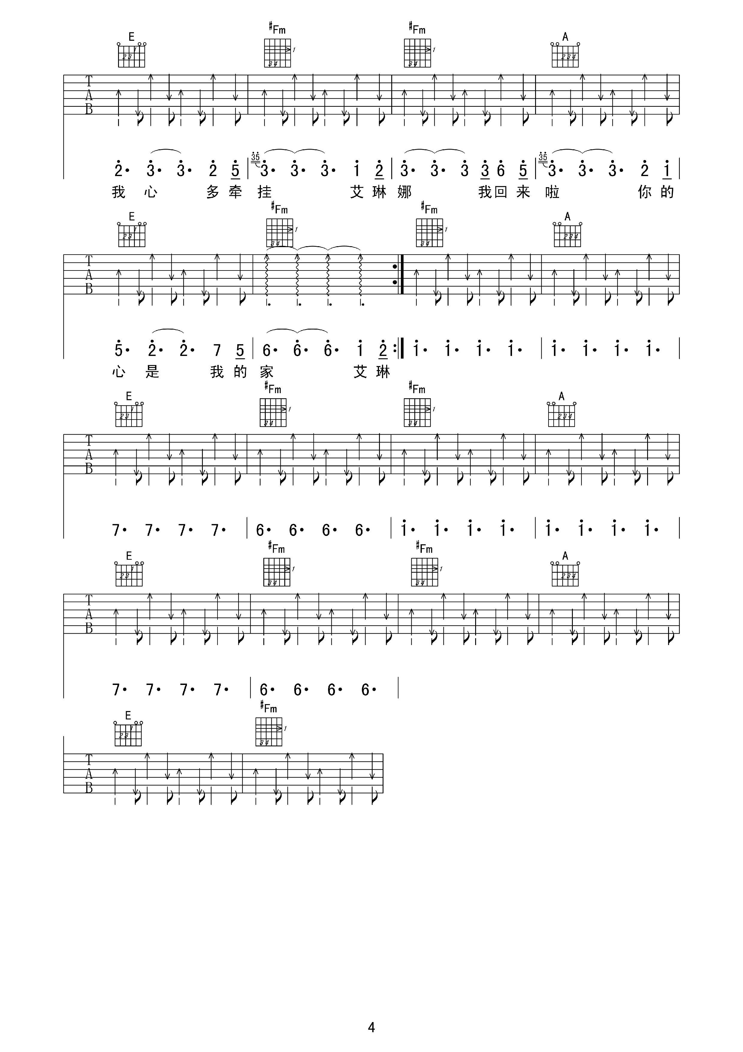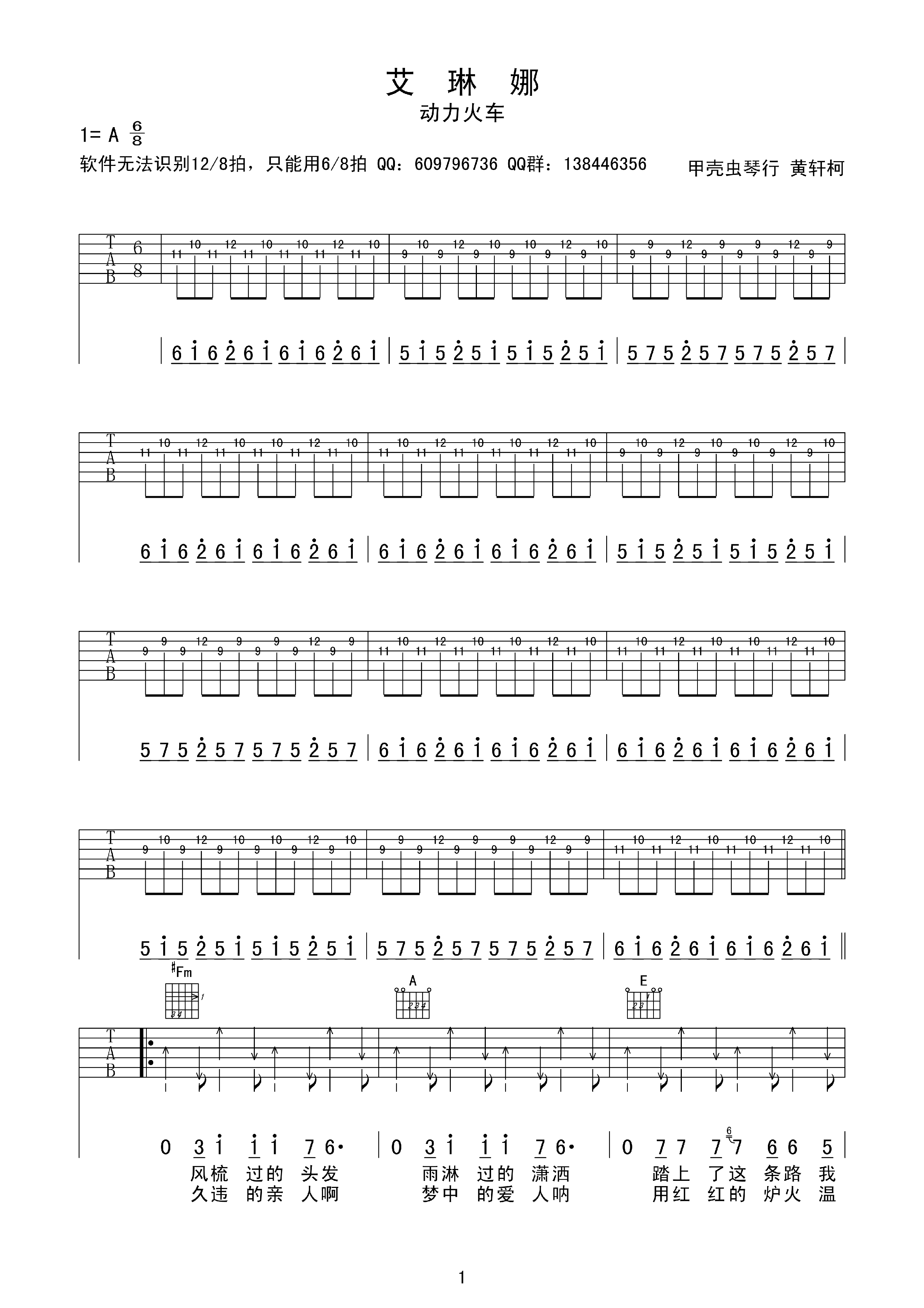 曲谱介绍: 动力火车《艾琳娜》吉他弹唱谱,采用A调指法编配,甲壳虫琴行编配出品,共有4张高清图谱。