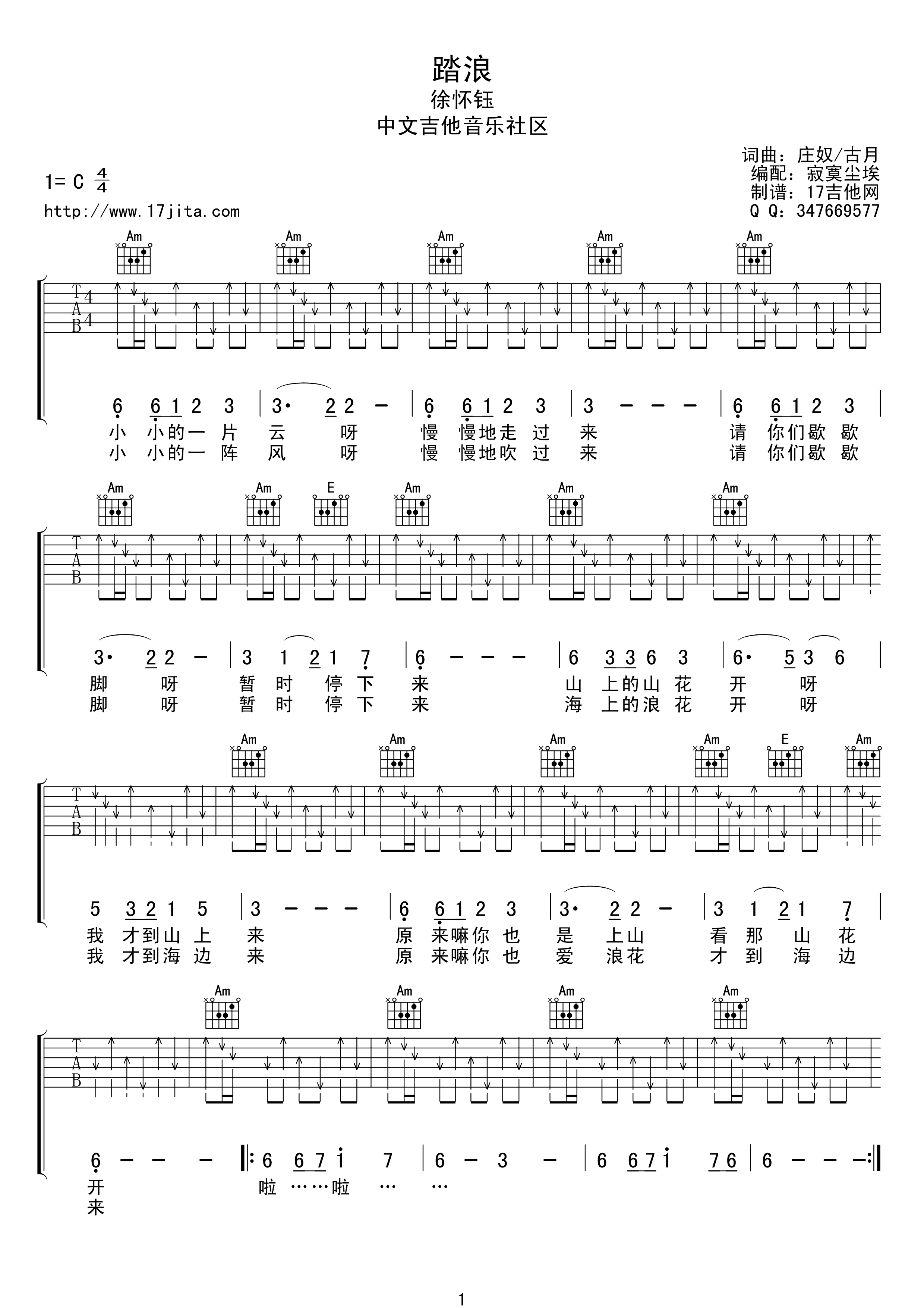 曲谱介绍: 徐怀钰《踏浪》吉他弹唱谱,采用C调指法编配,寂寞尘埃编配出品,共有1张高清图谱,免翻页排版设计。