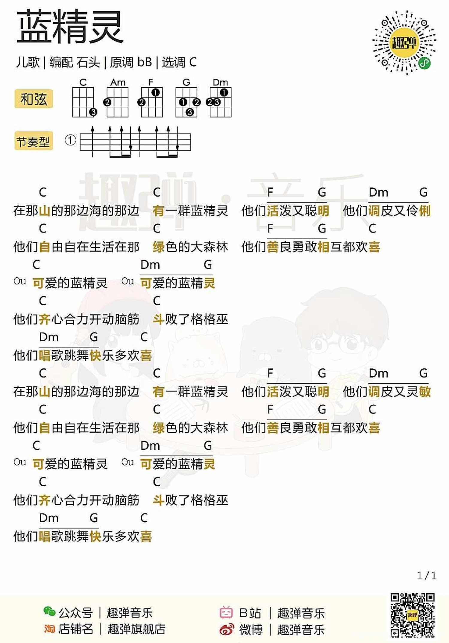 曲谱介绍: 儿歌《蓝精灵》尤克里里谱,共有1张高清图谱,免翻页排版设计。