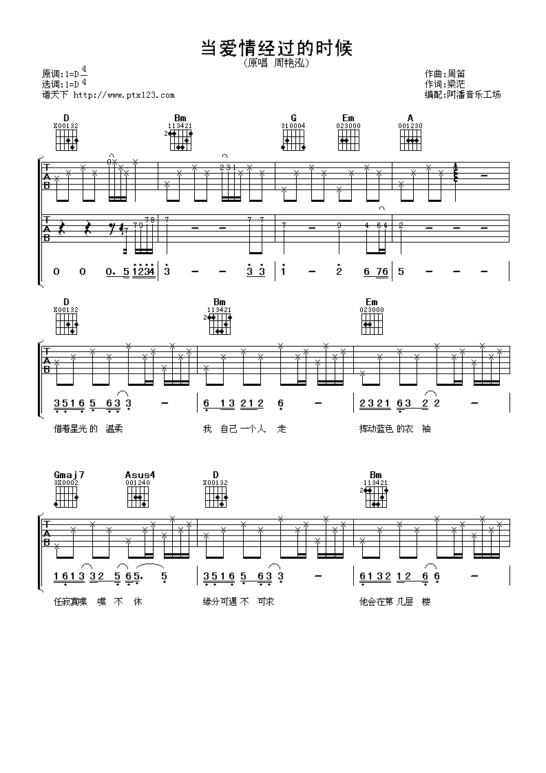 曲谱介绍: 周艳泓《当爱情经过的时候》吉他弹唱谱,采用D调指法编配,阿潘音乐工场编配出品,共有3张高清图谱。