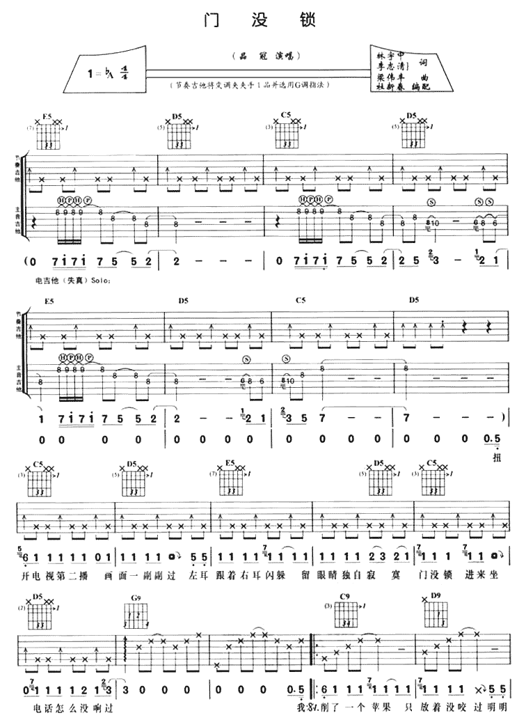 曲谱介绍: 品冠《门没锁》吉他弹唱谱,采用A调指法编配,共有5张高清图谱。