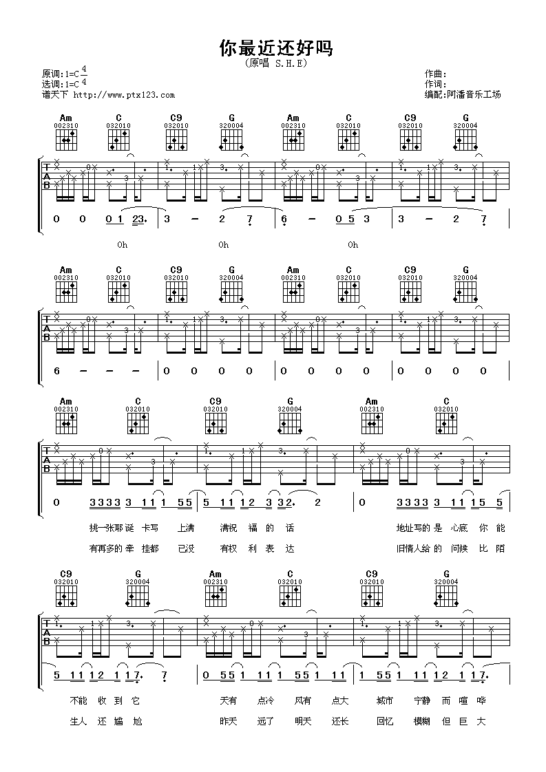 曲谱介绍: S.H.E《你最近还好吗》吉他弹唱谱,采用C调指法编配,阿潘音乐工场编配出品,共有3张高清图谱。