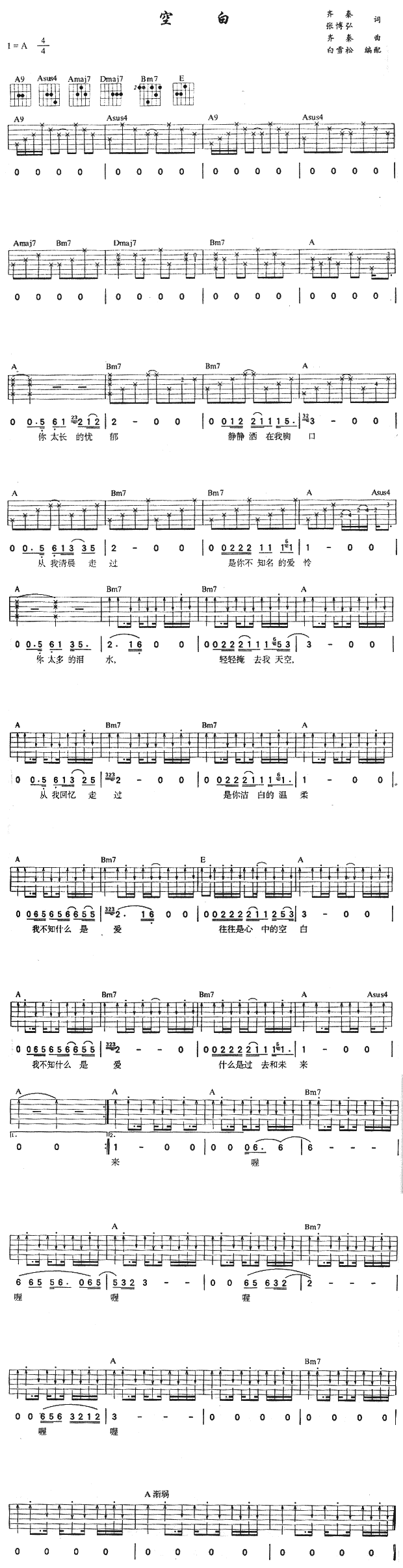 曲谱介绍: 齐秦《空白》吉他弹唱谱,采用A调指法编配,白雪松编配出品,共有1张高清图谱,免翻页排版设计。