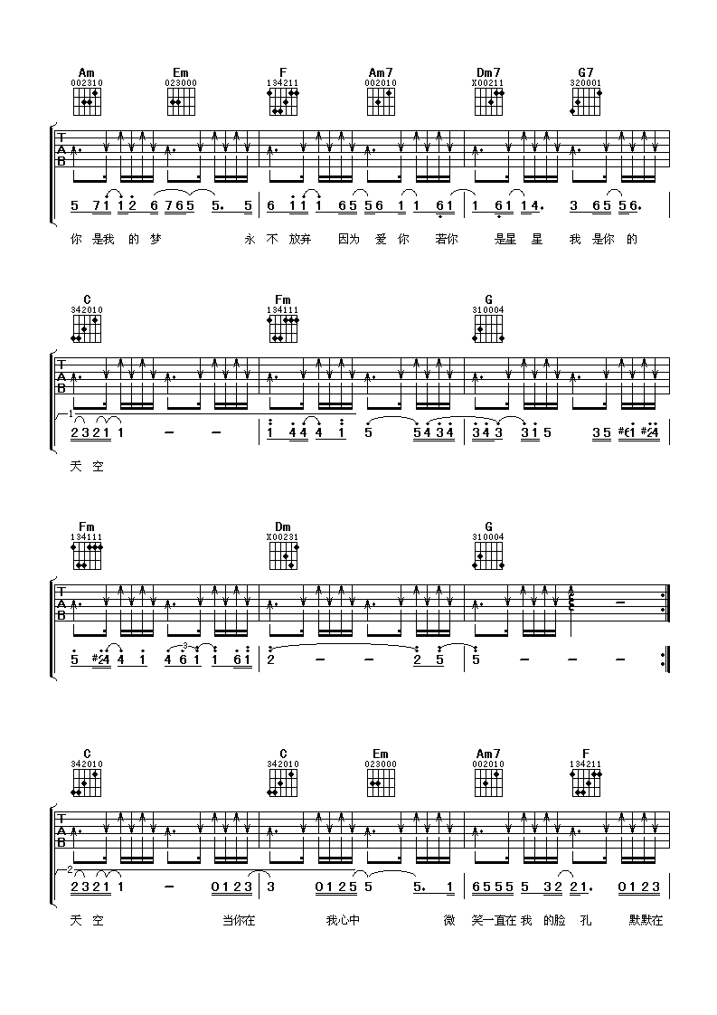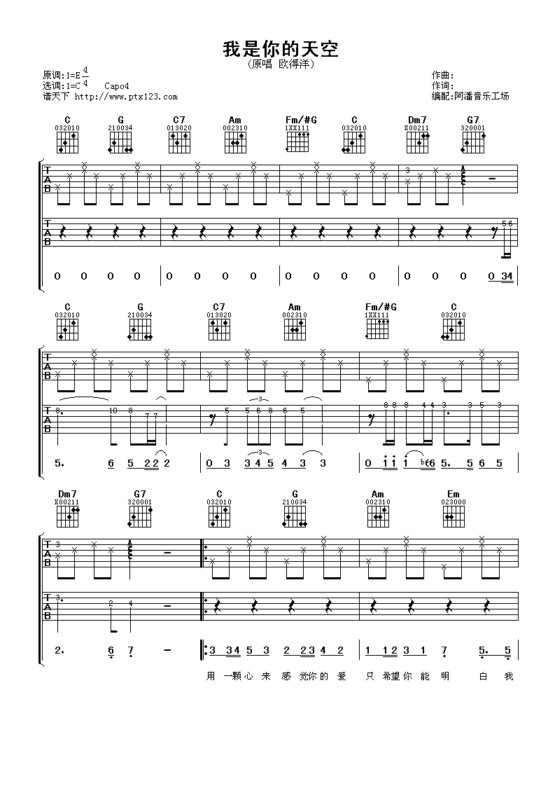 曲谱介绍: 欧得洋《我是你的天空》吉他弹唱谱,采用C调指法编配,阿潘音乐工场编配出品,共有4张高清图谱。