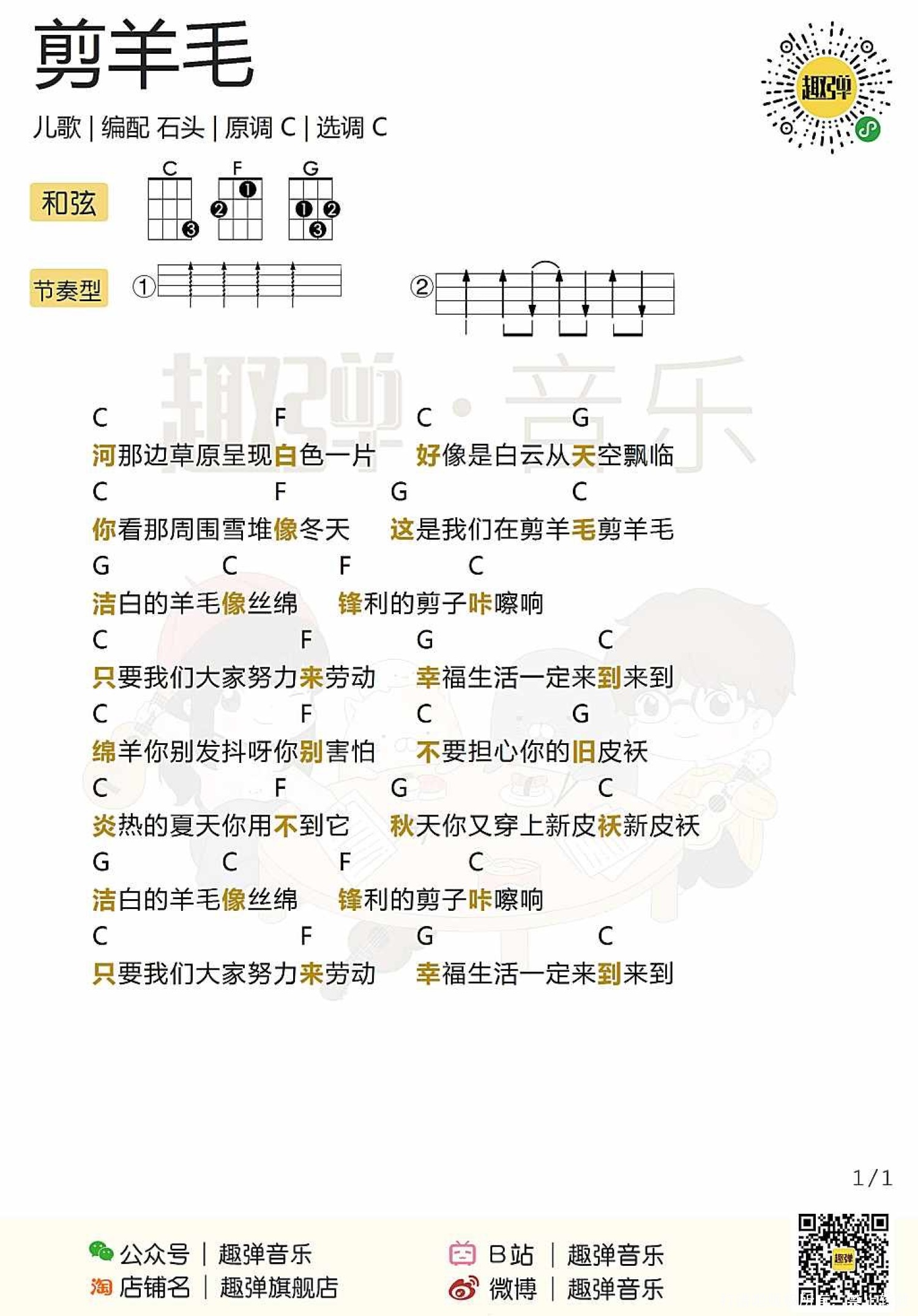 曲谱介绍: 儿歌《剪羊毛》尤克里里谱,共有1张高清图谱,免翻页排版设计。