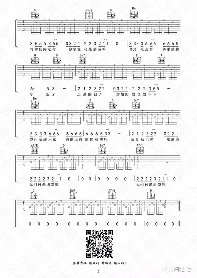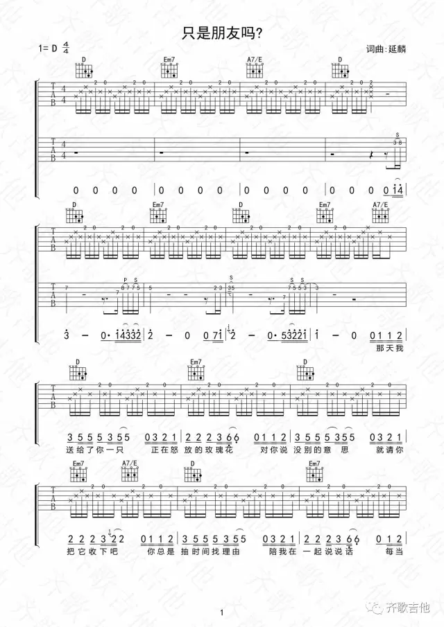 曲谱介绍: 林安《只是朋友吗》吉他弹唱谱,采用D调指法编配,齐歌吉他编配出品,共有2张高清图谱,免翻页排版设计。