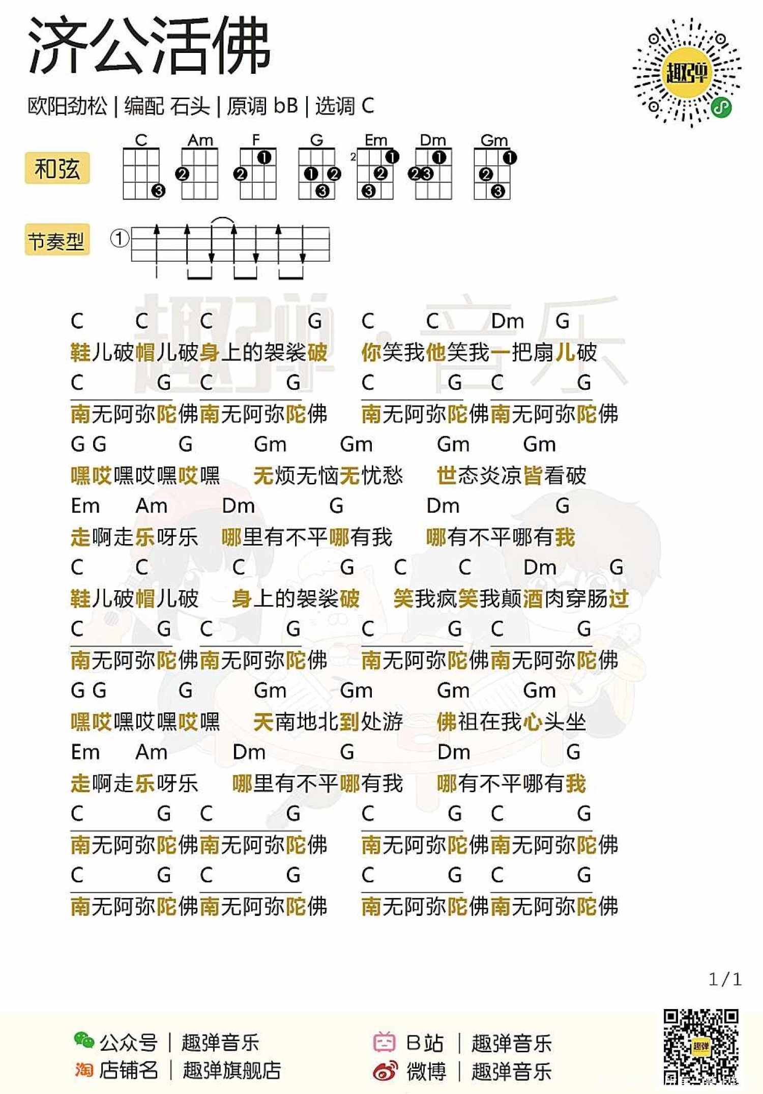 曲谱介绍: 欧阳劲松《济公活佛》尤克里里谱,共有1张高清图谱,免翻页排版设计。