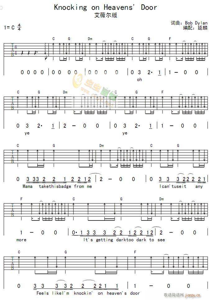 曲谱介绍: 艾薇儿《敲开天堂之门》吉他弹唱谱,采用C调指法编配,延麟编配出品,共有1张高清图谱,免翻页排版设计。