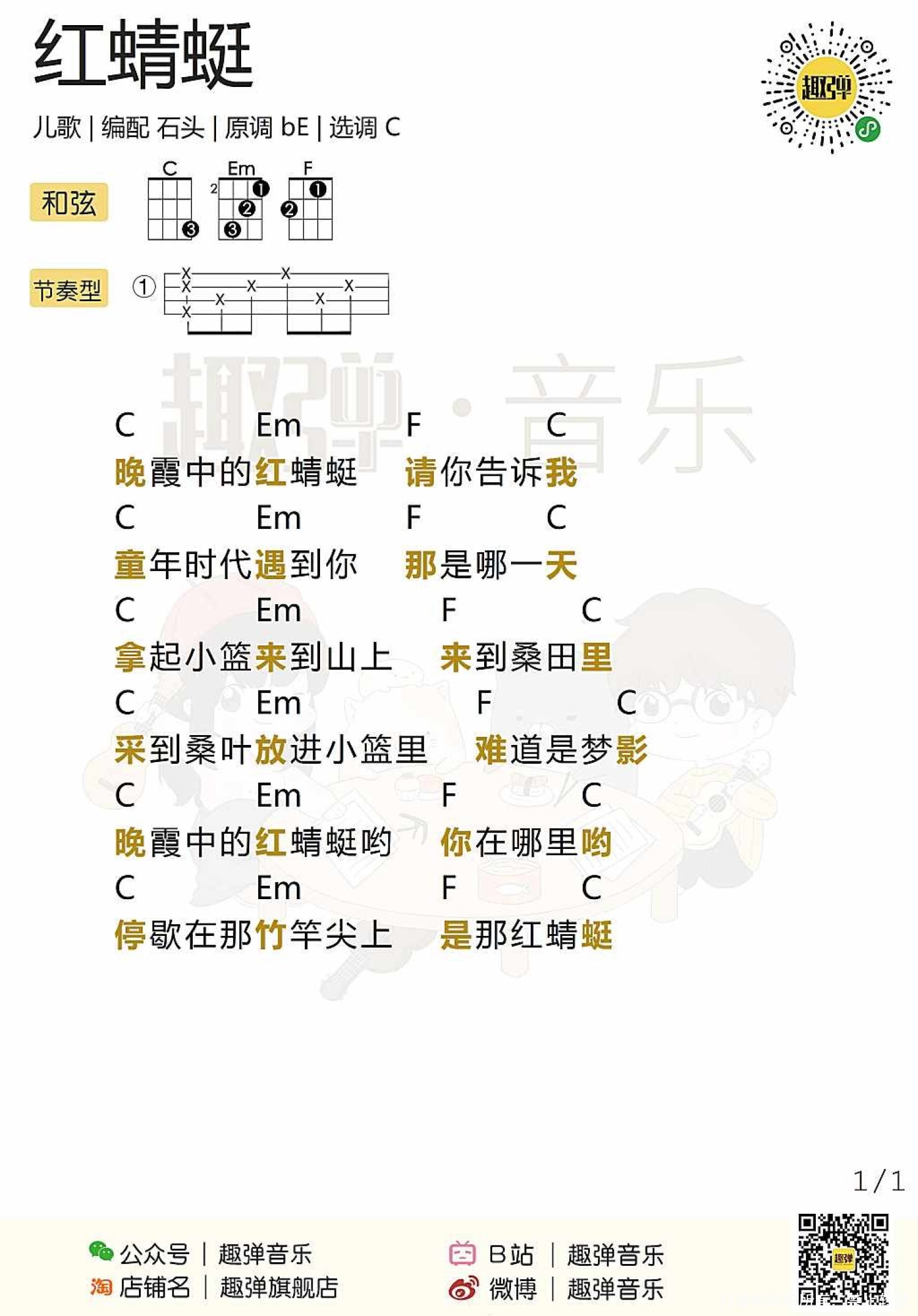 曲谱介绍: 儿歌《红蜻蜓》尤克里里谱,共有1张高清图谱,免翻页排版设计。