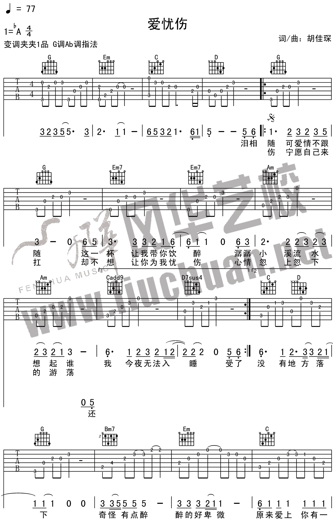 曲谱介绍: 胡佳琛《爱忧伤》吉他弹唱谱,采用A调指法编配,风华艺校编配出品,共有2张高清图谱,免翻页排版设计。