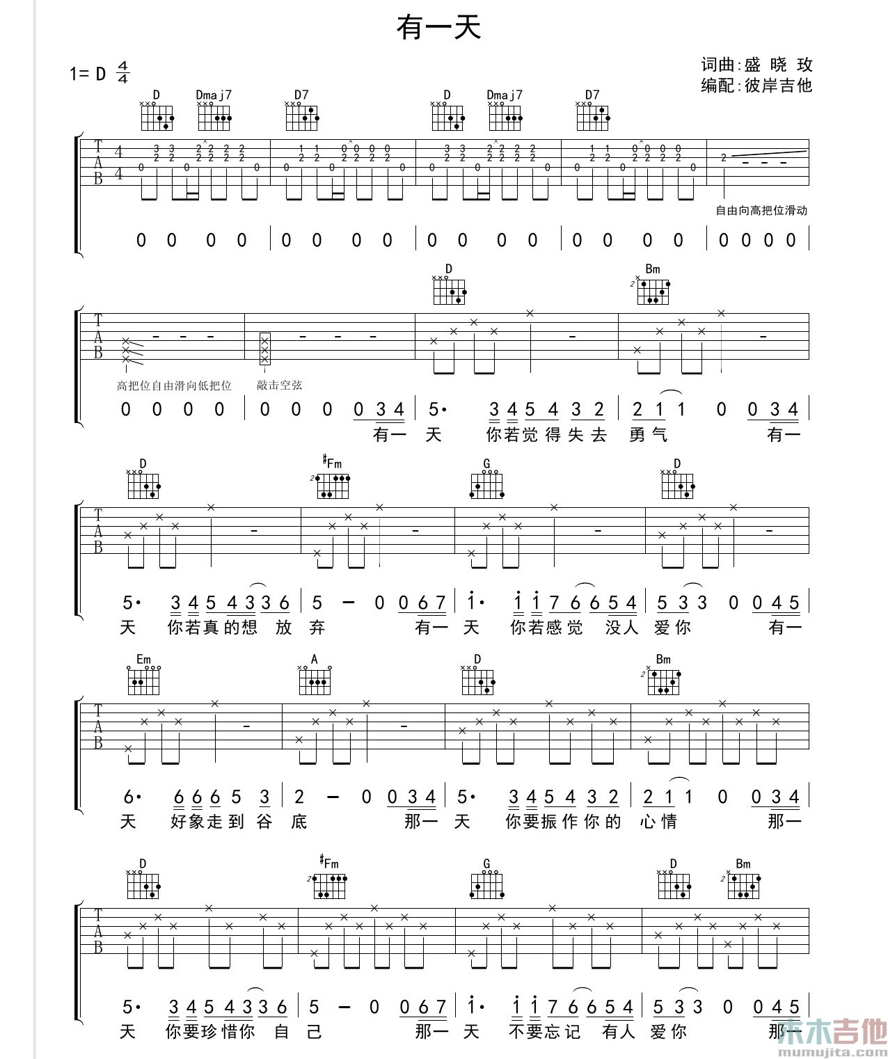 曲谱介绍: 盛晓玫《有一天》吉他弹唱谱,采用D调指法编配,彼岸吉他编配出品,共有2张高清图谱,免翻页排版设计。