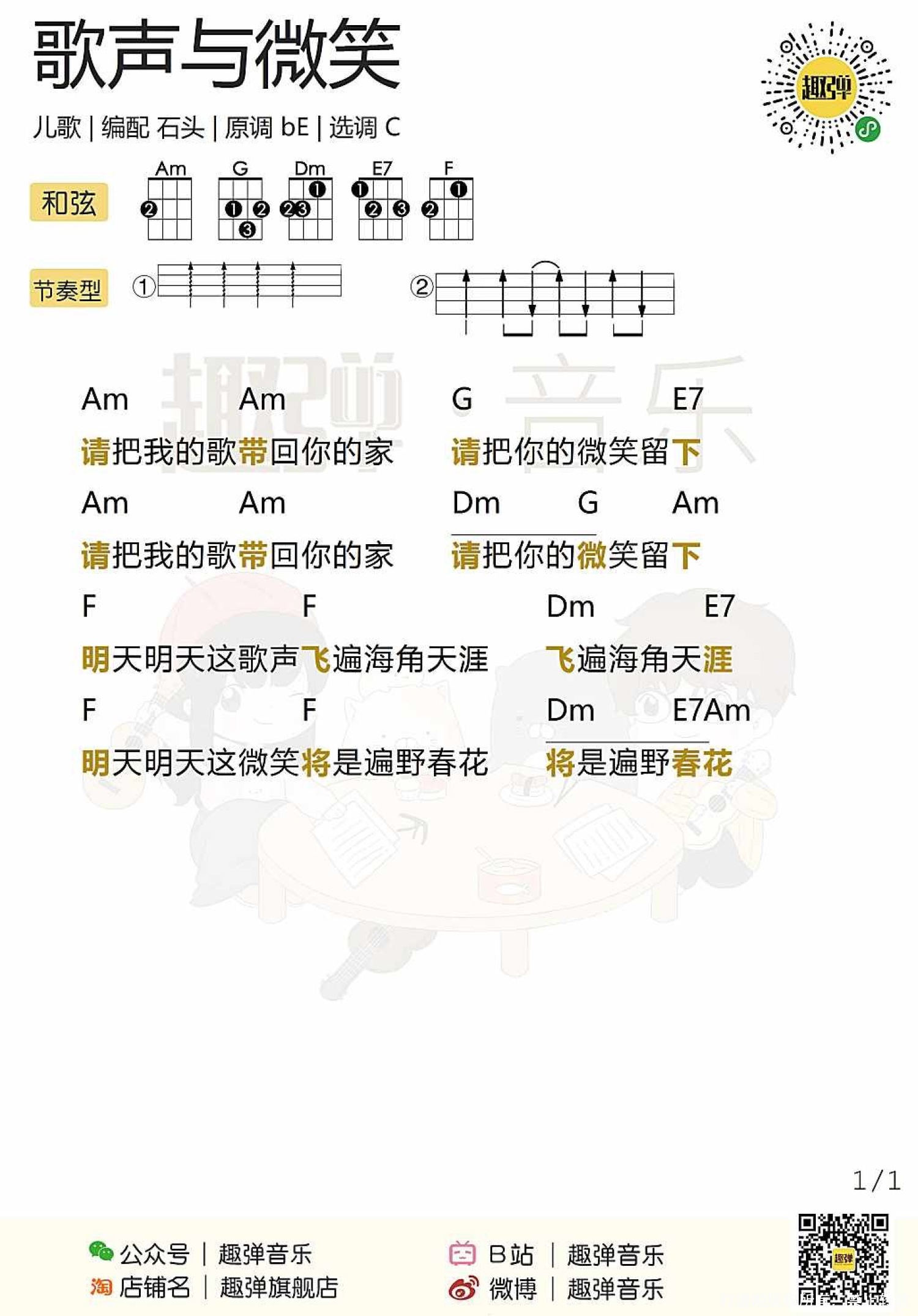 曲谱介绍: 儿歌《歌声与微笑》尤克里里谱,共有1张高清图谱,免翻页排版设计。