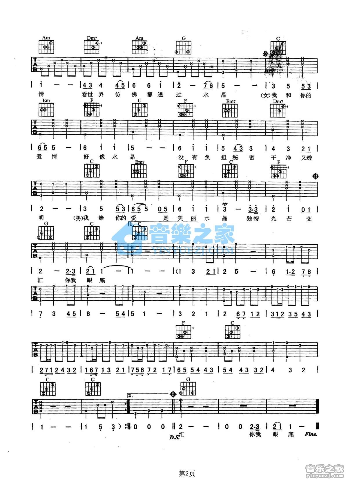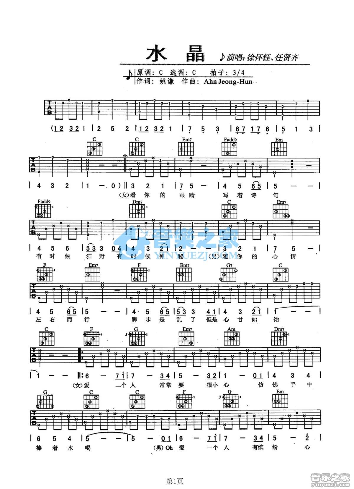 曲谱介绍: 任贤齐《水晶》吉他弹唱谱,采用C调指法编配,音乐之家编配出品,共有2张高清图谱,免翻页排版设计。