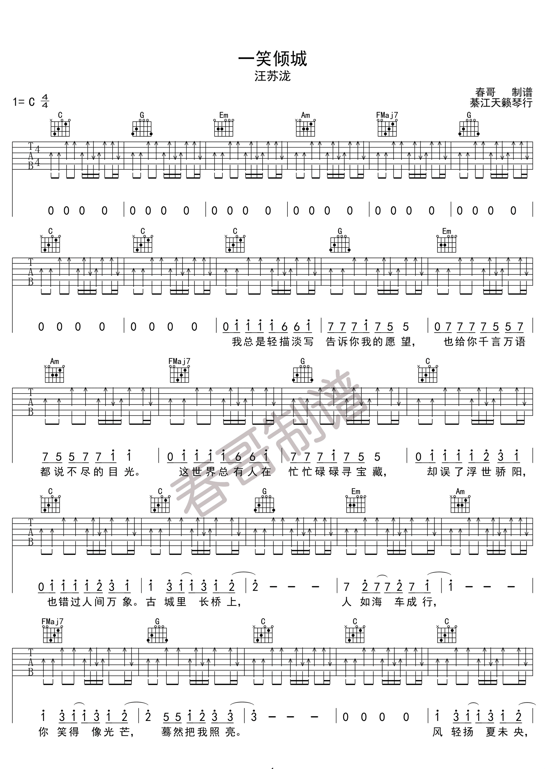 曲谱介绍: 汪苏泷《一笑倾城》吉他弹唱谱,采用C调指法编配,春哥制谱编配出品,共有2张高清图谱,免翻页排版设计。