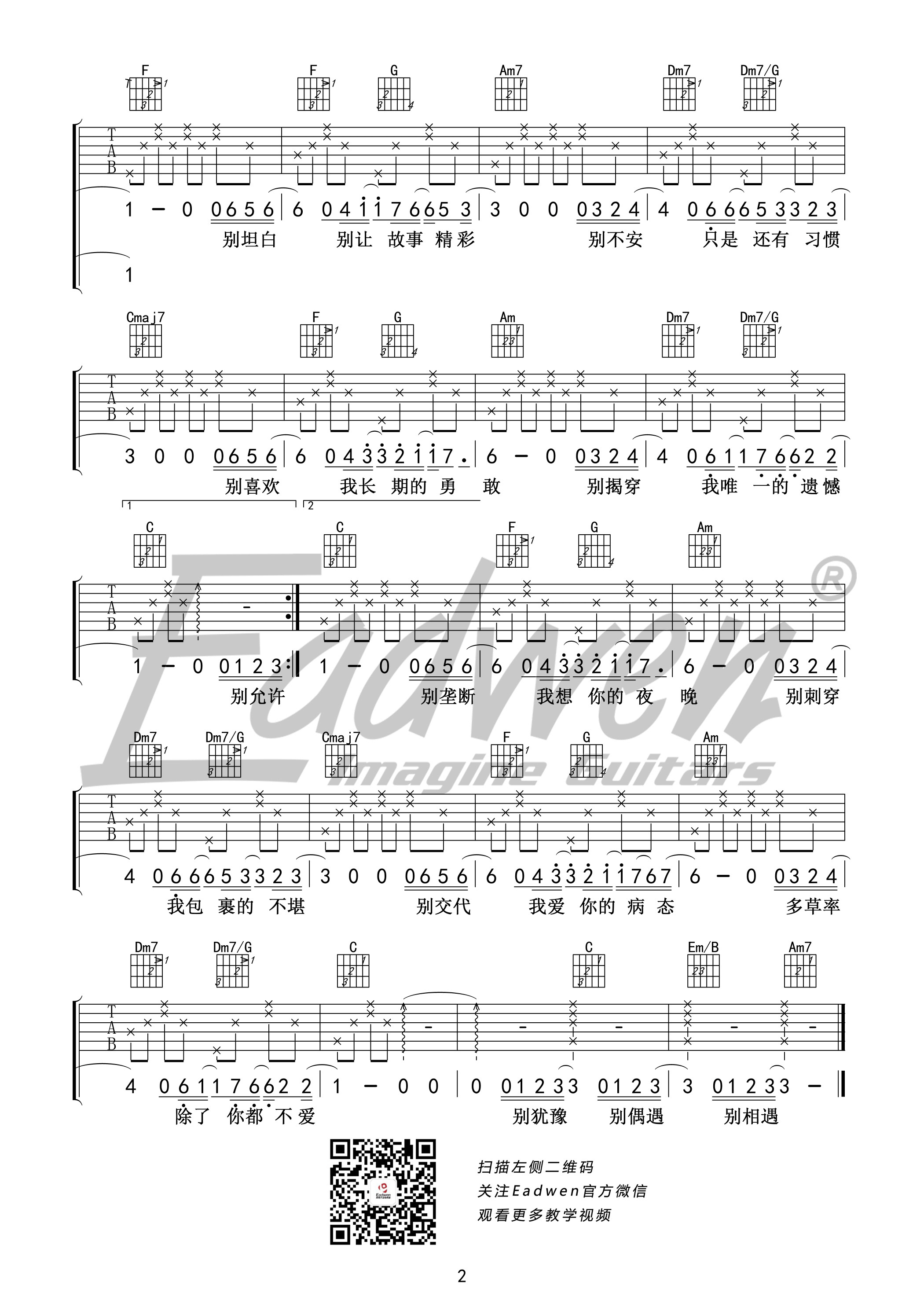 曲谱介绍: 薛之谦《别》吉他弹唱谱,采用C调指法编配,爱德文吉他教室编配出品,共有2张高清图谱,免翻页排版设计。