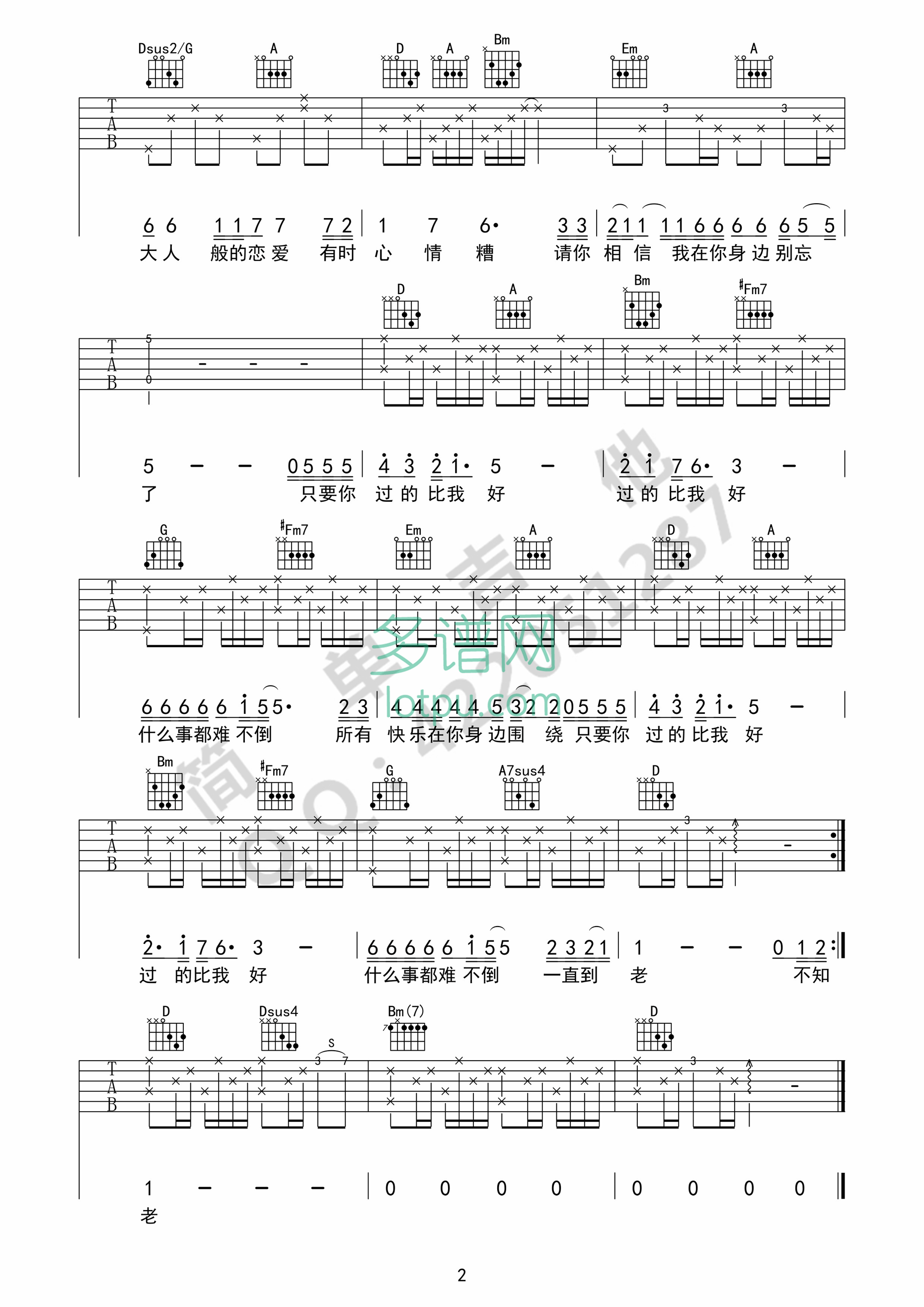 曲谱介绍: 钟镇涛《只要你过得比我好》吉他弹唱谱,采用D调指法编配,简单吉他编配出品,共有2张高清图谱,免翻页排版设计。