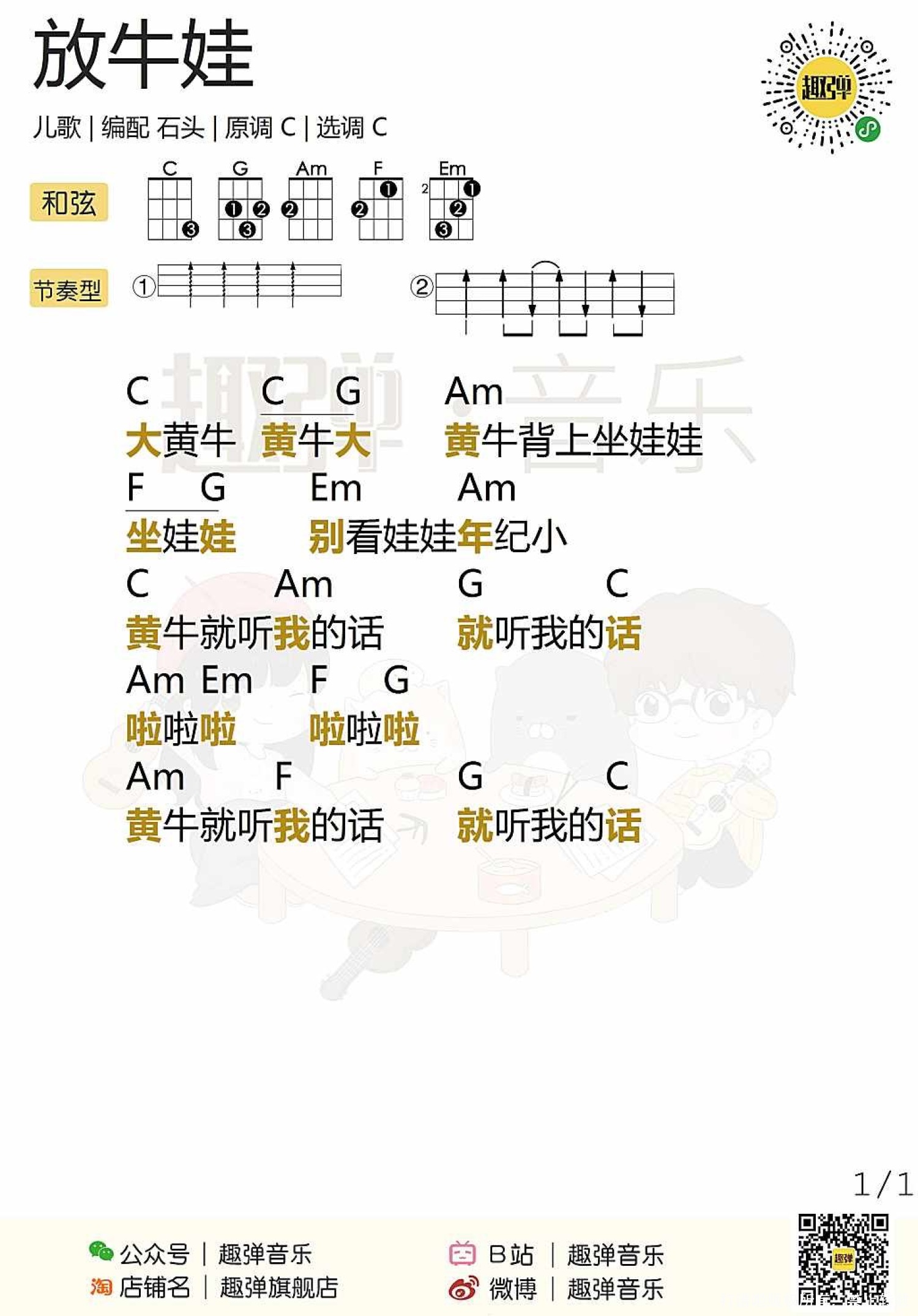 曲谱介绍: 儿歌《放牛娃》尤克里里谱,共有1张高清图谱,免翻页排版设计。