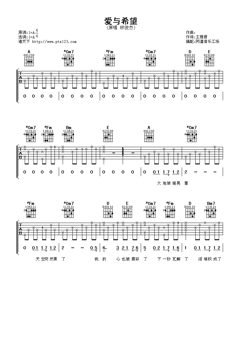 曲谱介绍: 林俊杰《爱与希望》吉他弹唱谱,采用A调指法编配,阿潘音乐工场编配出品,共有3张高清图谱。