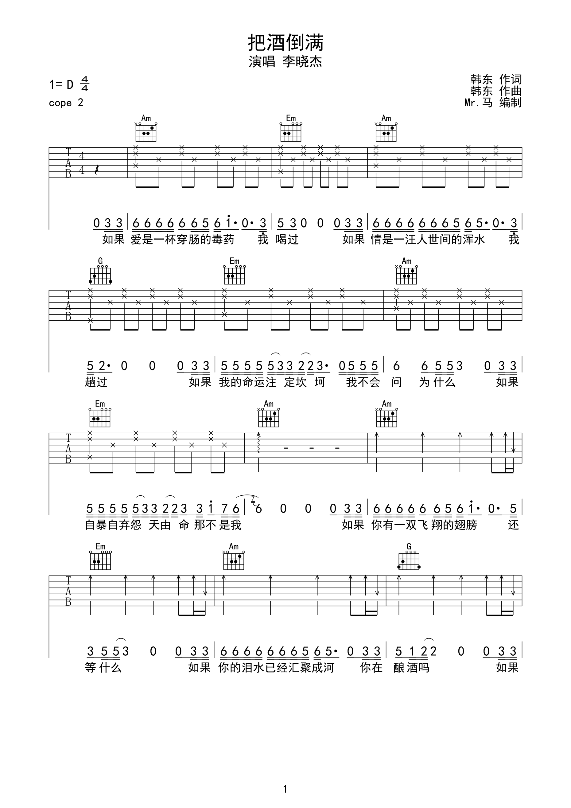 把酒倒满吉他谱 - 李晓杰 - D调吉他弹唱谱