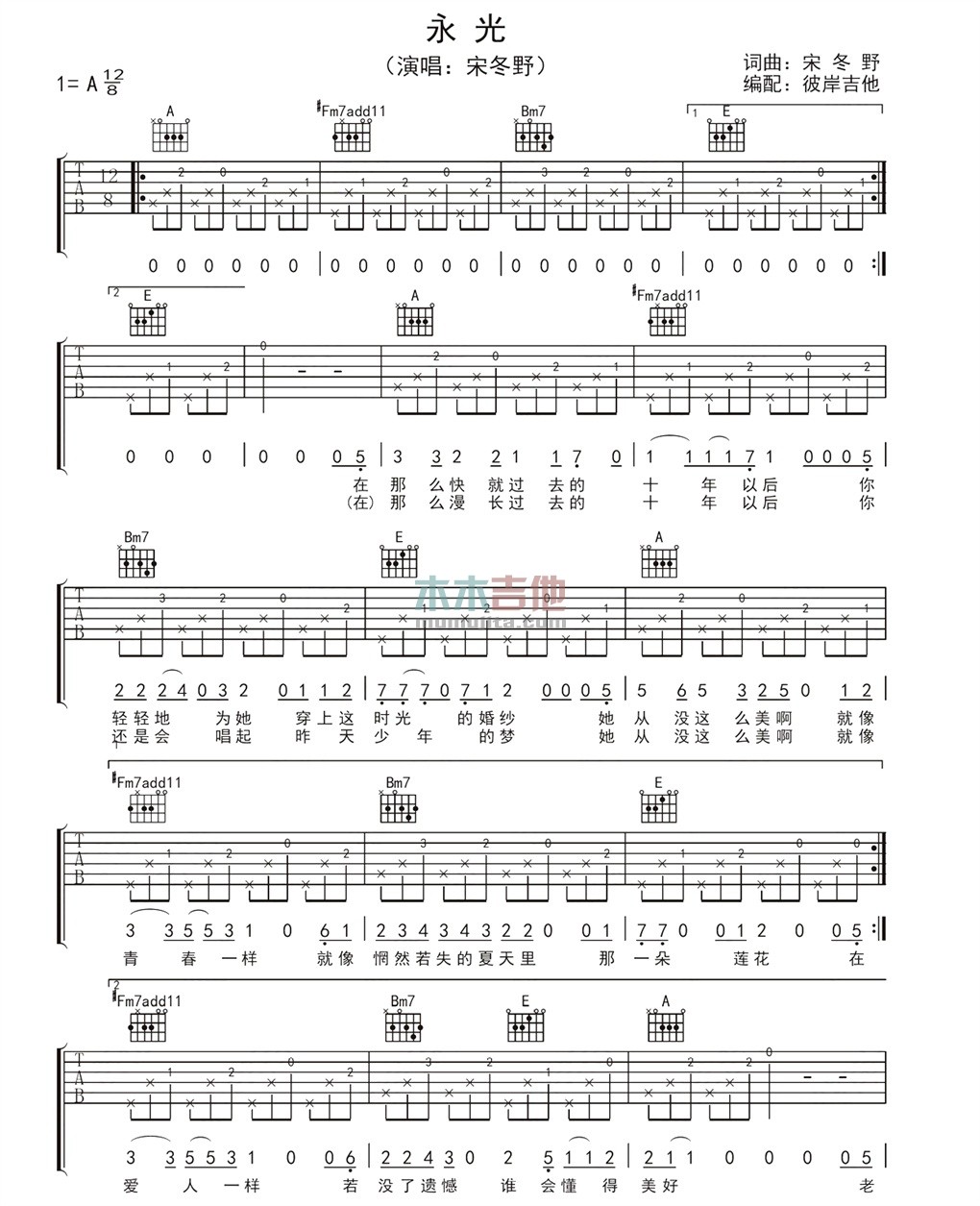 曲谱介绍: 宋冬野《永光》吉他弹唱谱,采用A调指法编配,彼岸吉他编配出品,共有2张高清图谱,免翻页排版设计。