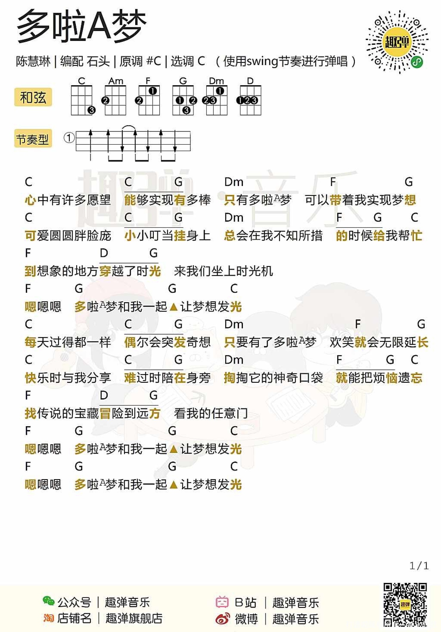 曲谱介绍: 陈慧琳《多啦A梦》尤克里里谱,共有1张高清图谱,免翻页排版设计。