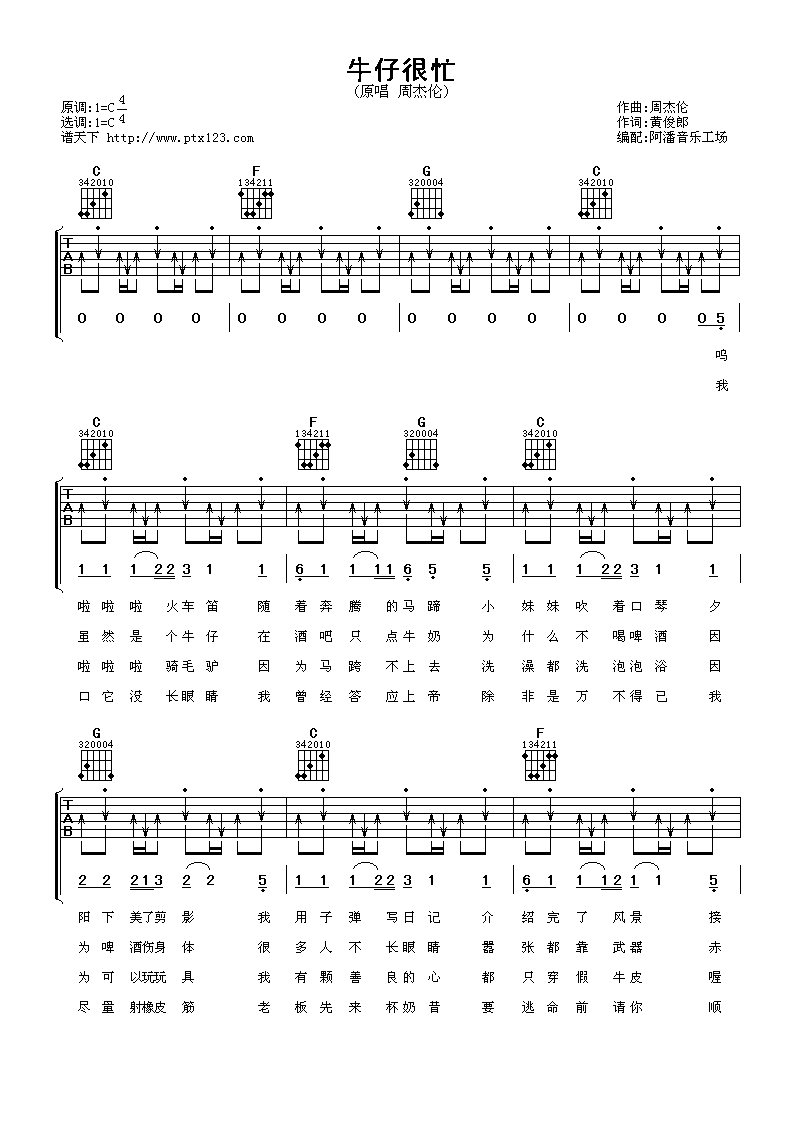 曲谱介绍: 周杰伦《牛仔很忙》吉他弹唱谱,采用C调指法编配,阿潘音乐工场编配出品,共有3张高清图谱。