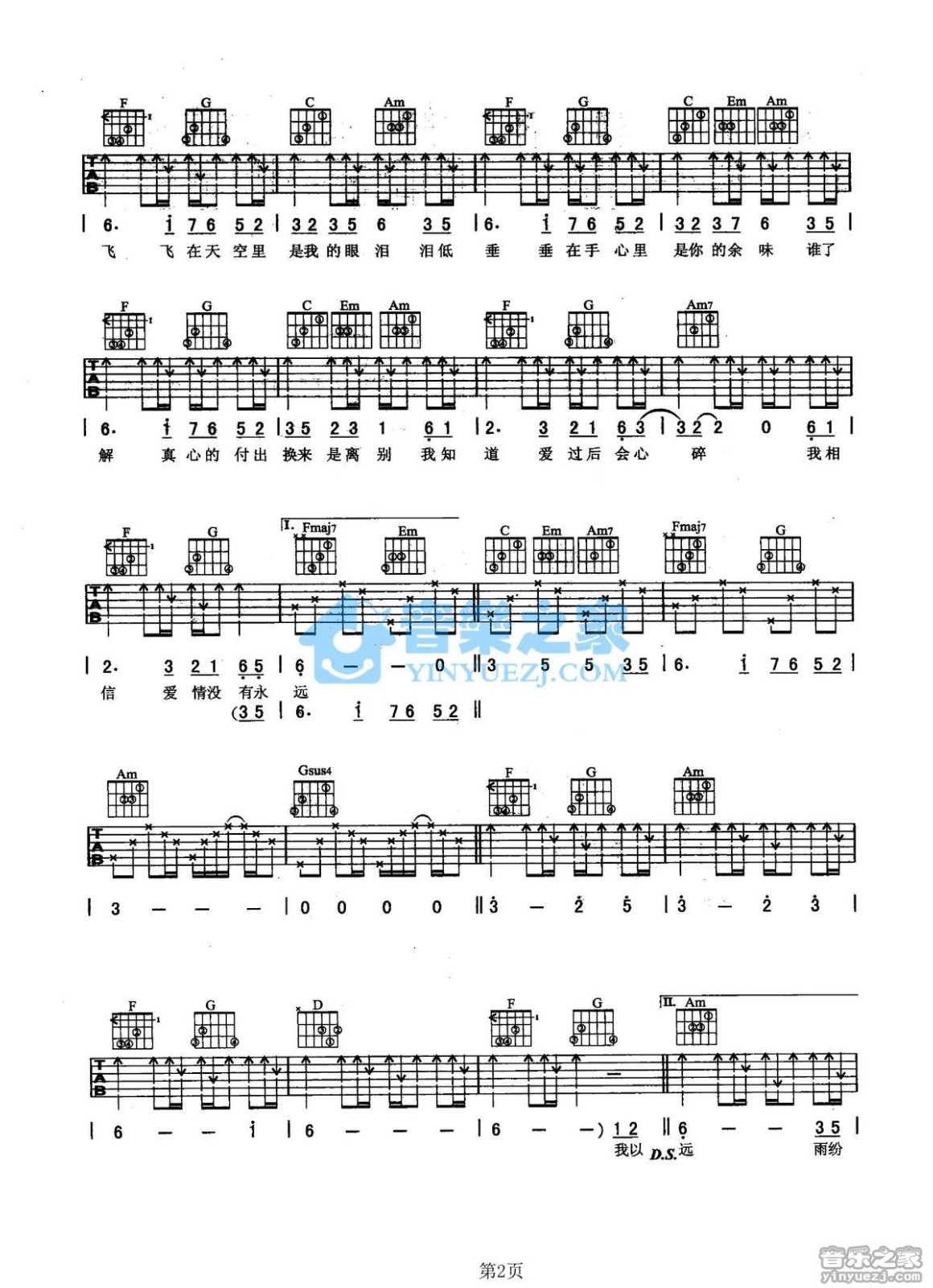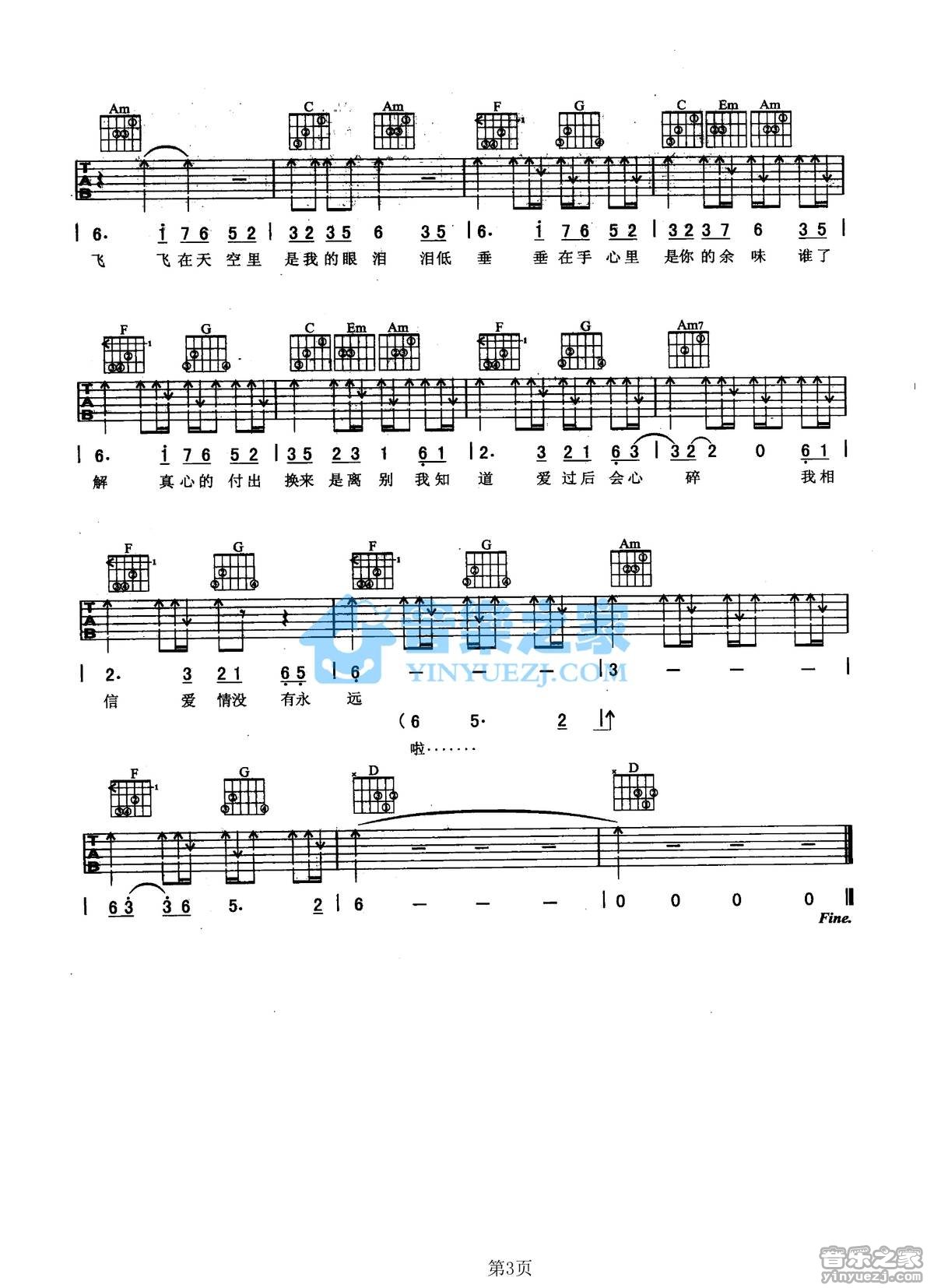 曲谱介绍: 徐怀钰《分飞》吉他弹唱谱,采用C调指法编配,音乐之家编配出品,共有3张高清图谱。