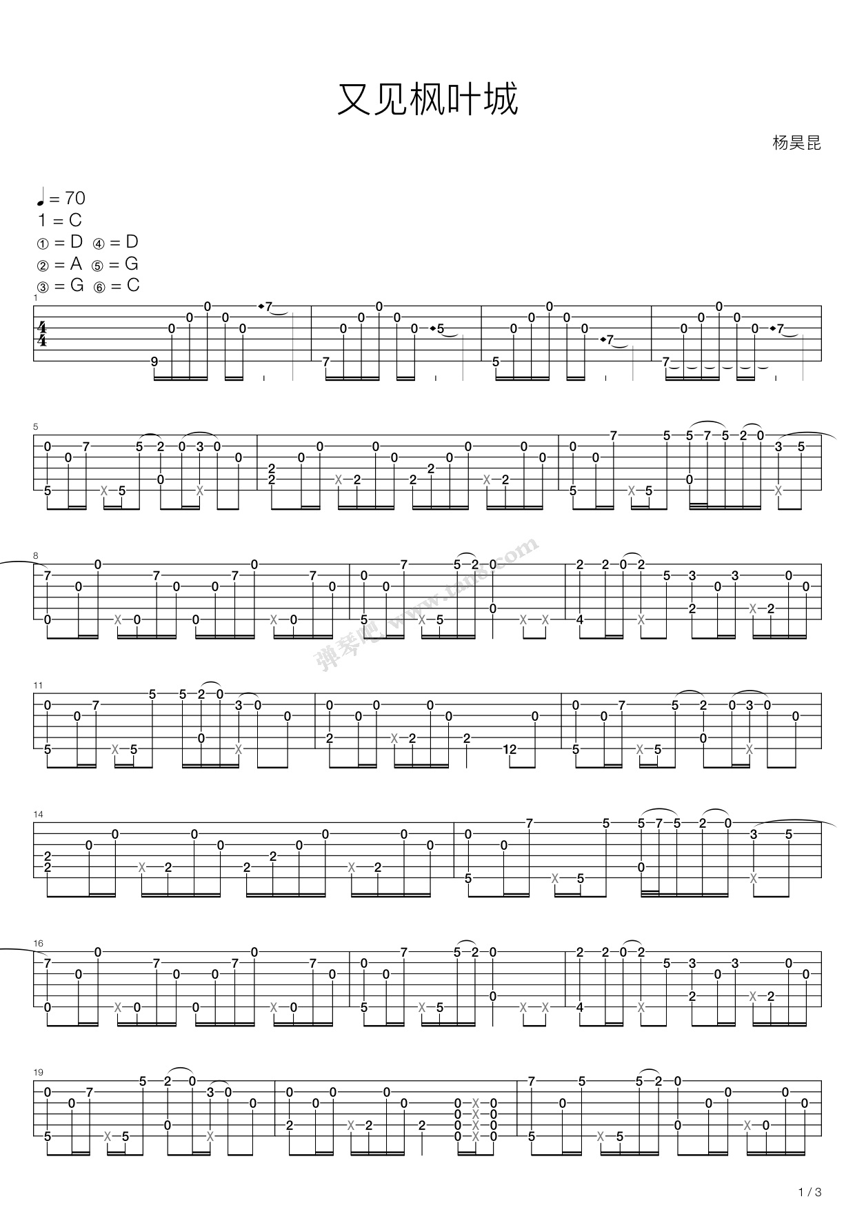 曲谱介绍: 杨昊昆《又见枫叶城》吉他独奏谱,采用C调指法编配,弹琴吧编配出品,共有3张高清图谱。