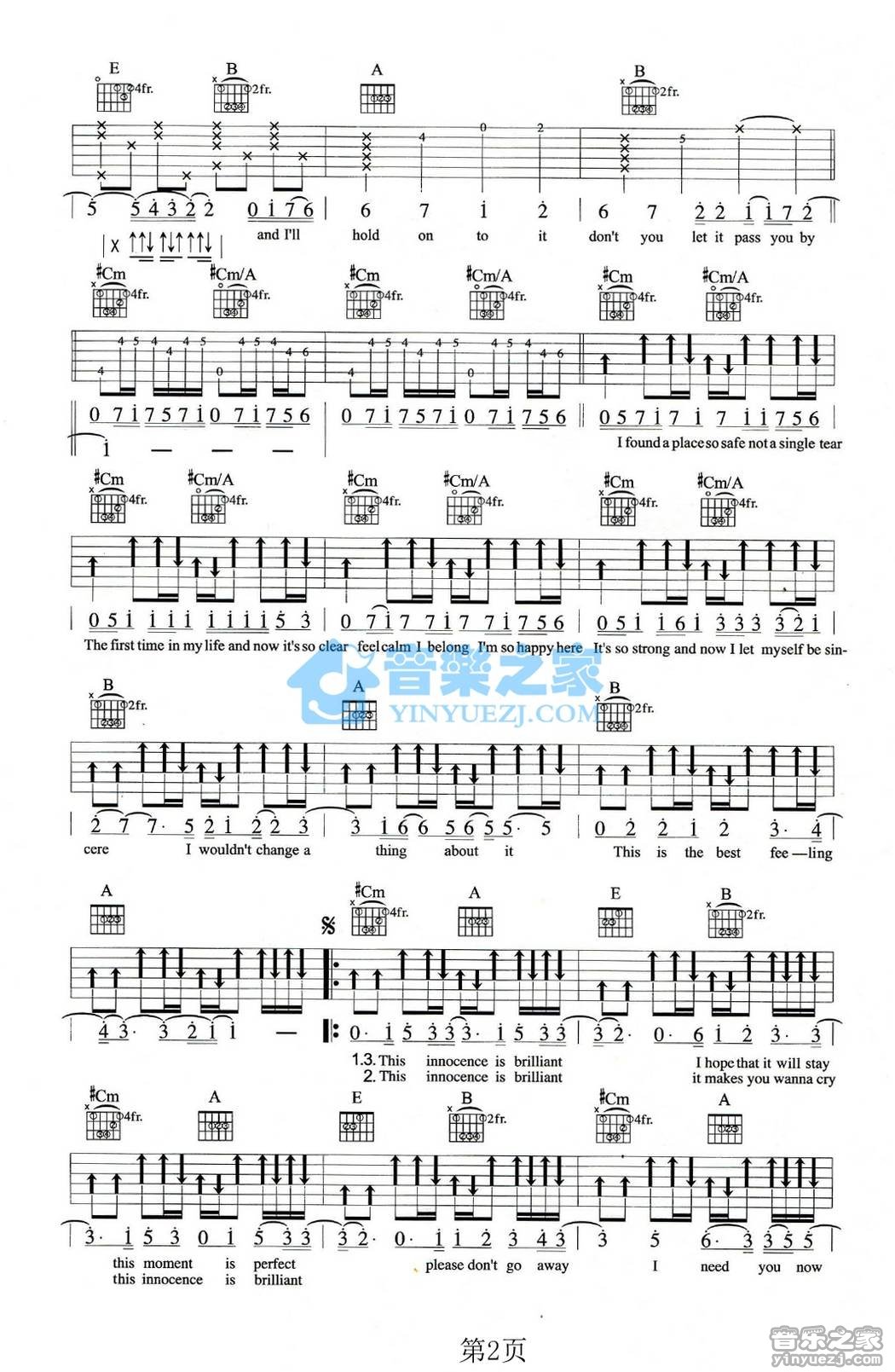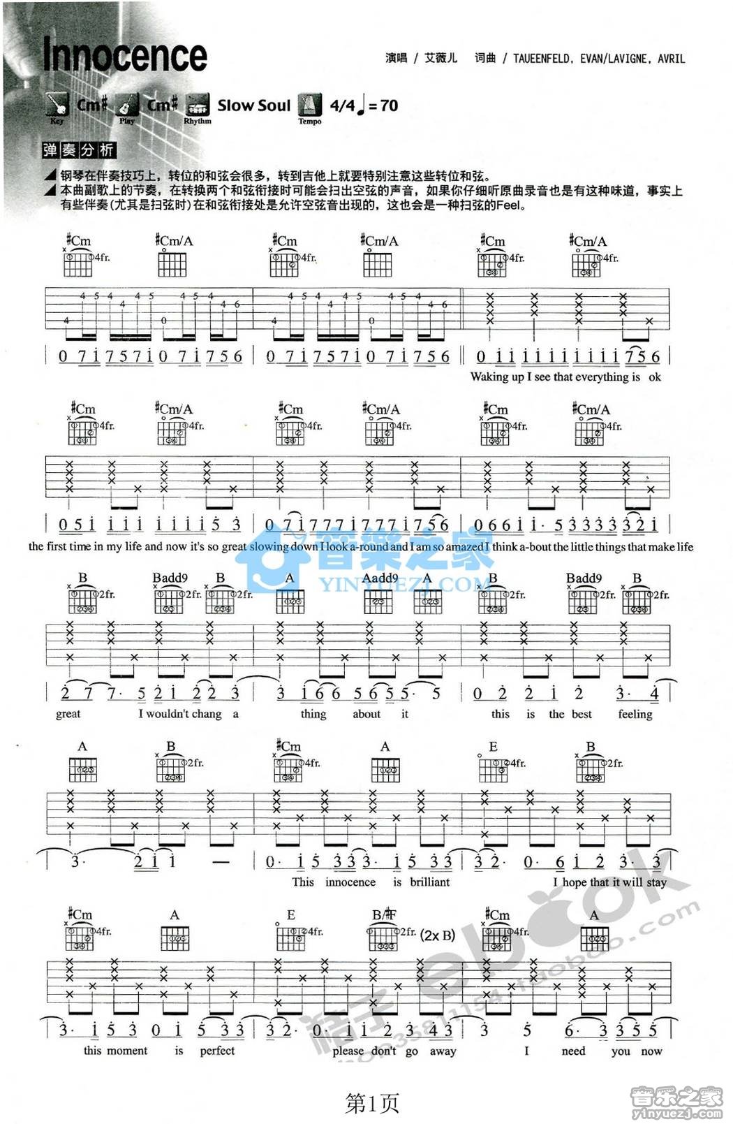曲谱介绍: 艾薇儿《Innocence》吉他弹唱谱,采用C调指法编配,音乐之家编配出品,共有3张高清图谱。